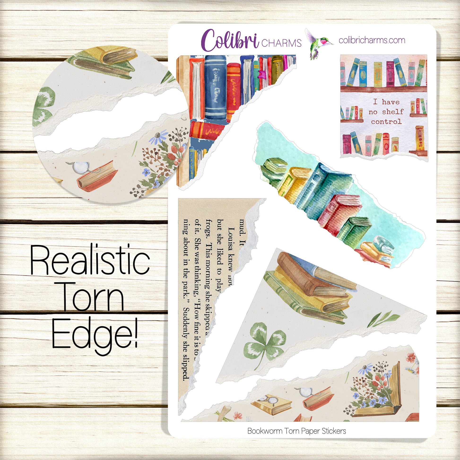 Bookworm Torn Paper Stickers | Book Lover Planner Decor | Avid Reader Stickers | Distressed Scrapbook Stickers | Ripped Paper