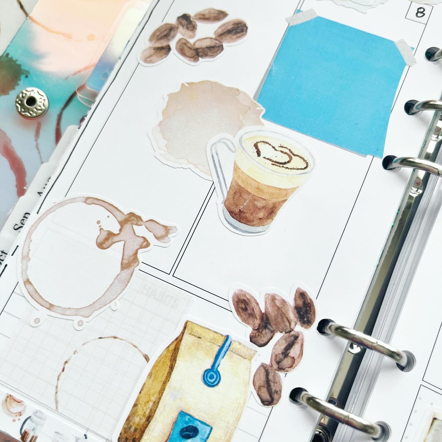 This set of journaling stickers is part of our coffee-themed collection, Coffee Break. Including deco, torn paper, day of the week labels, washi and journaling spot stickers, they will look great in your planner, bullet journal, or scrapbook.