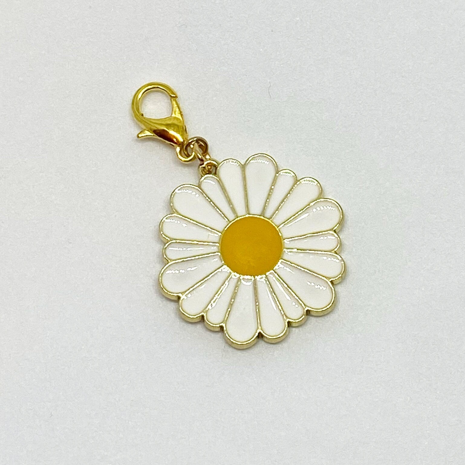 This lovely white and yellow enameled daisy charm with champagne gold lobster clasp is perfect for the elastic of your traveler's notebook, your badge reel, knitting stitch marker, or the rings of your planner with optional extender.