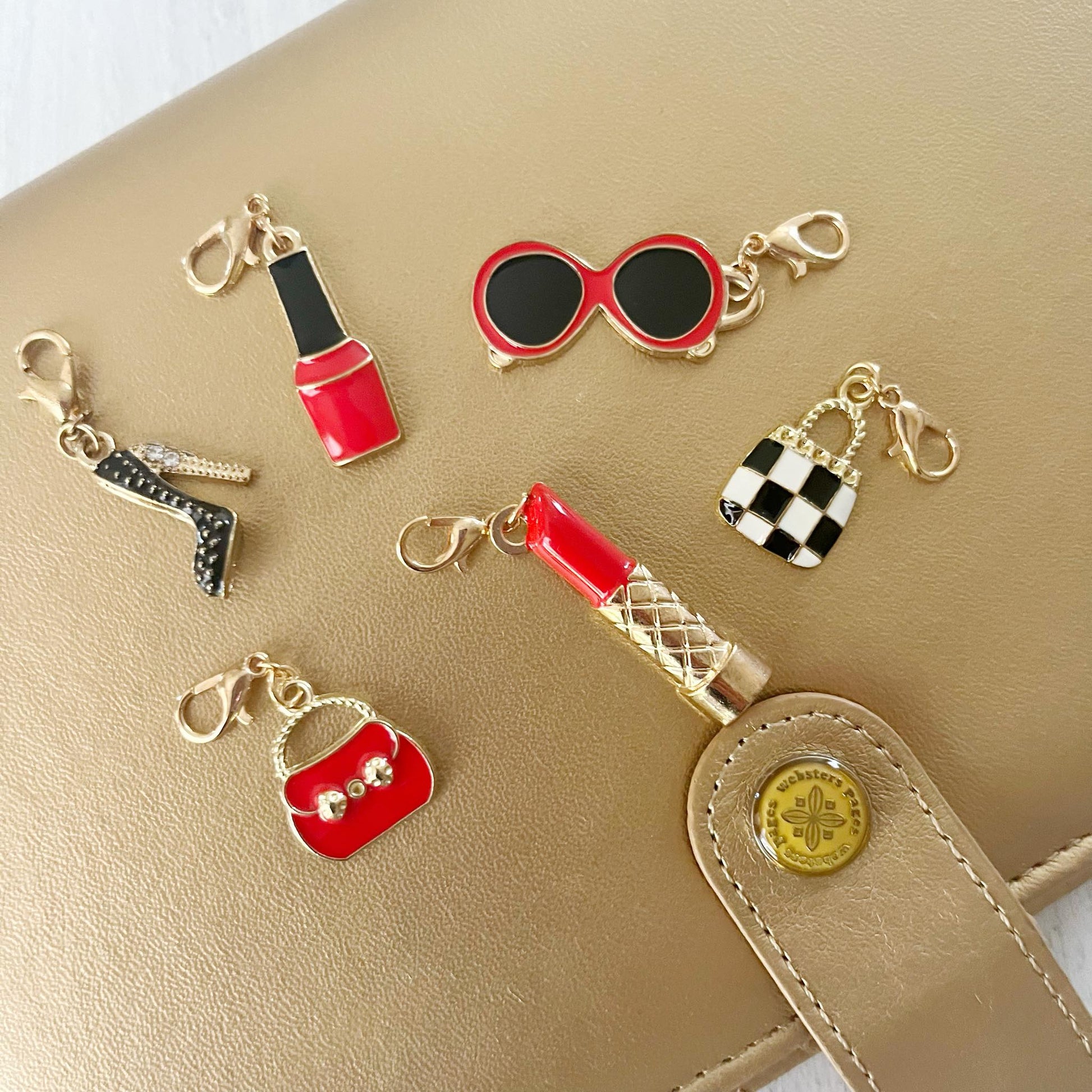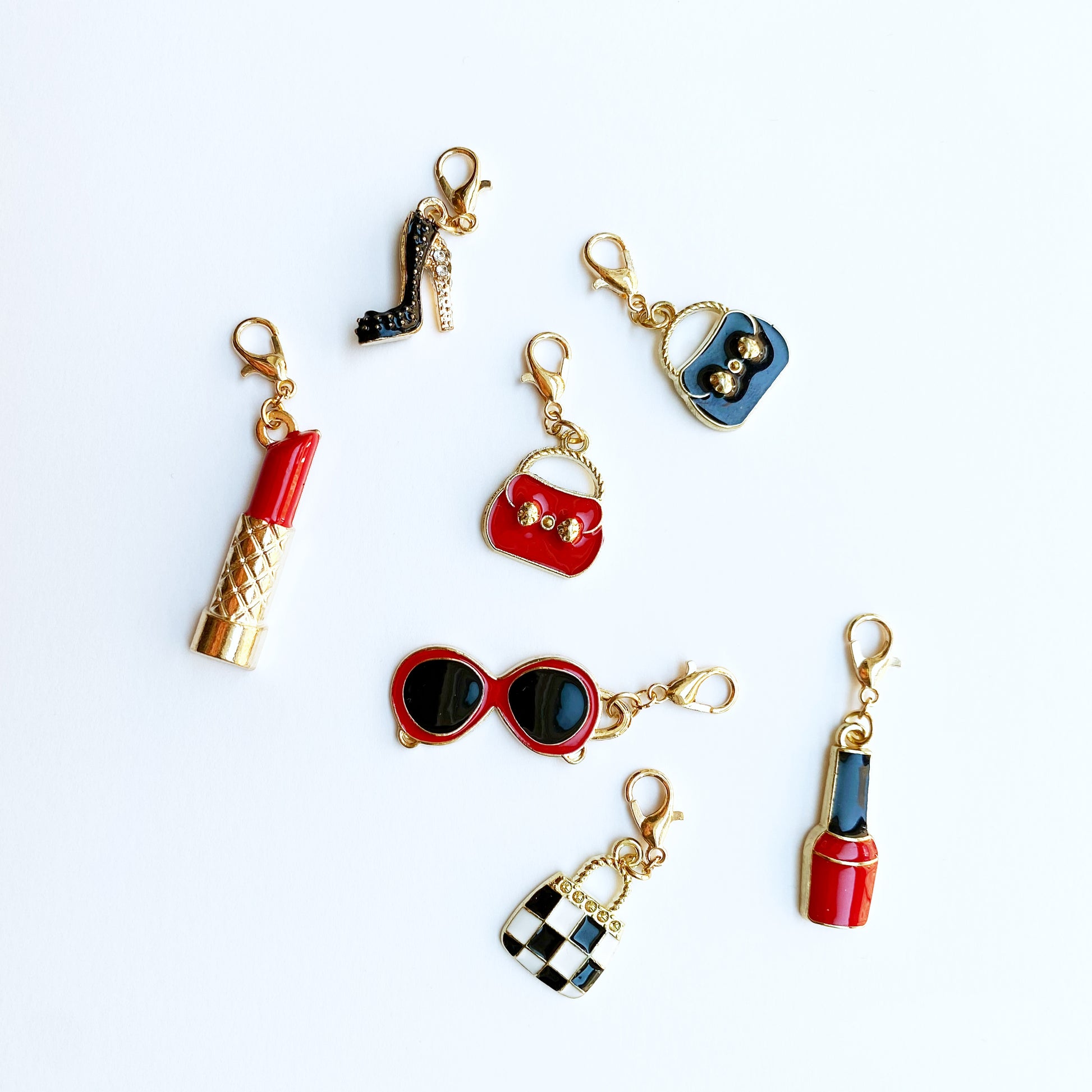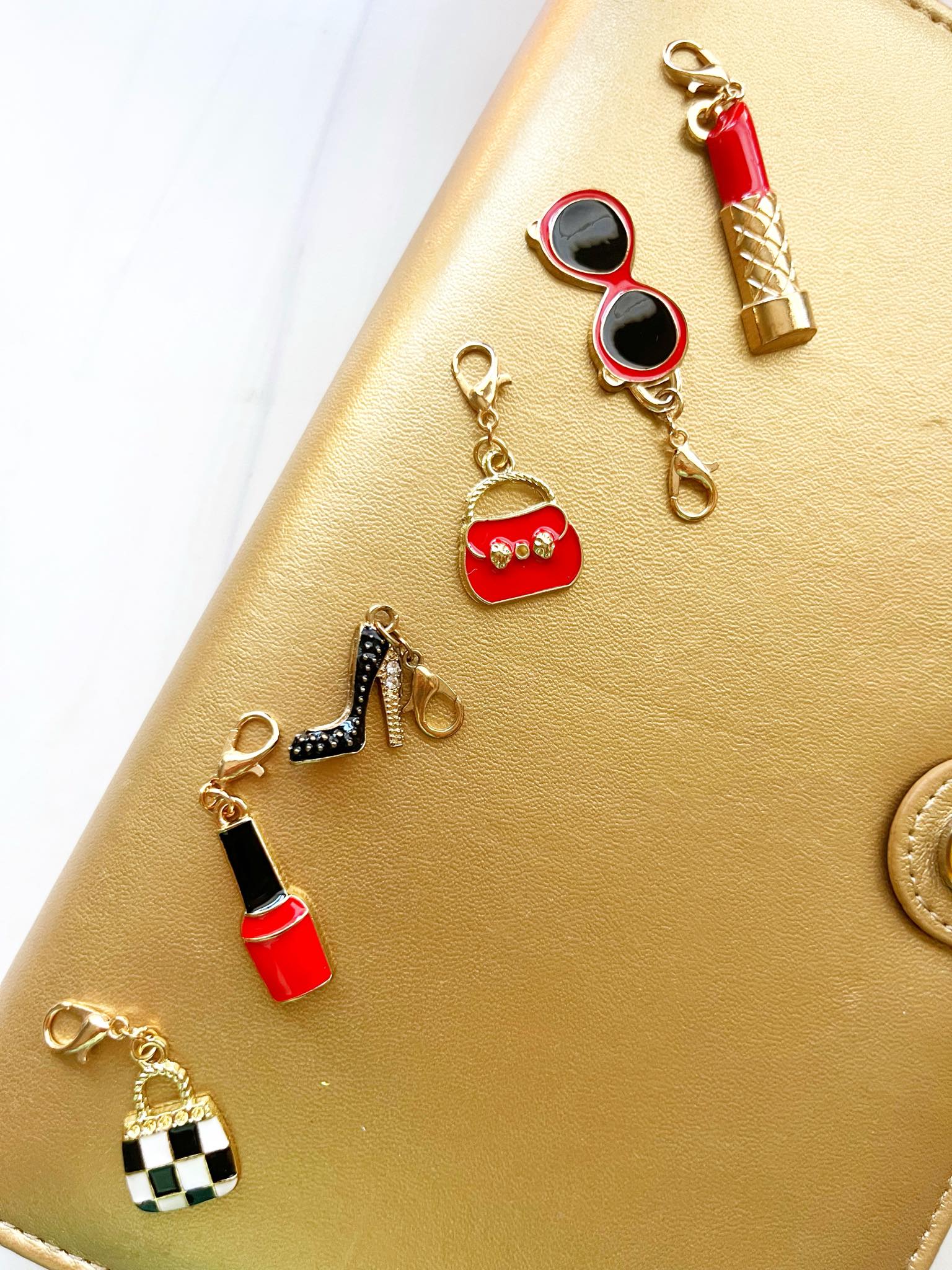 These cute fashion charms will be perfect for your planner set up, or your badge reel or knitting. Choose from a nail polish bottle, black handbag, red handbag, red lipstick, red sunglasses, black checked handbag, or black rhinestone high-heeled shoe. Available with champagne gold-tone clasp, gold jumbo paper clip, or gold-tone bookmark.