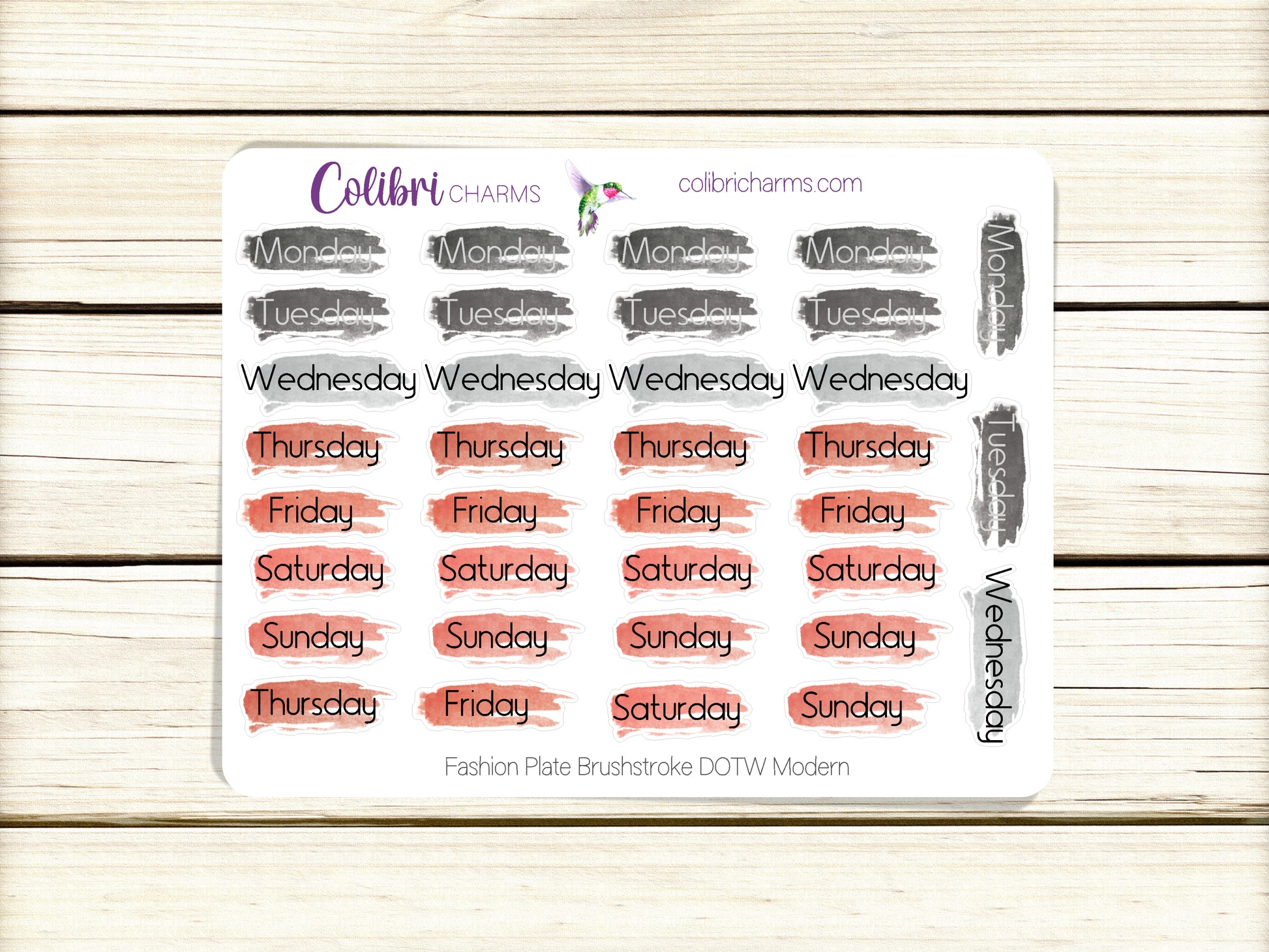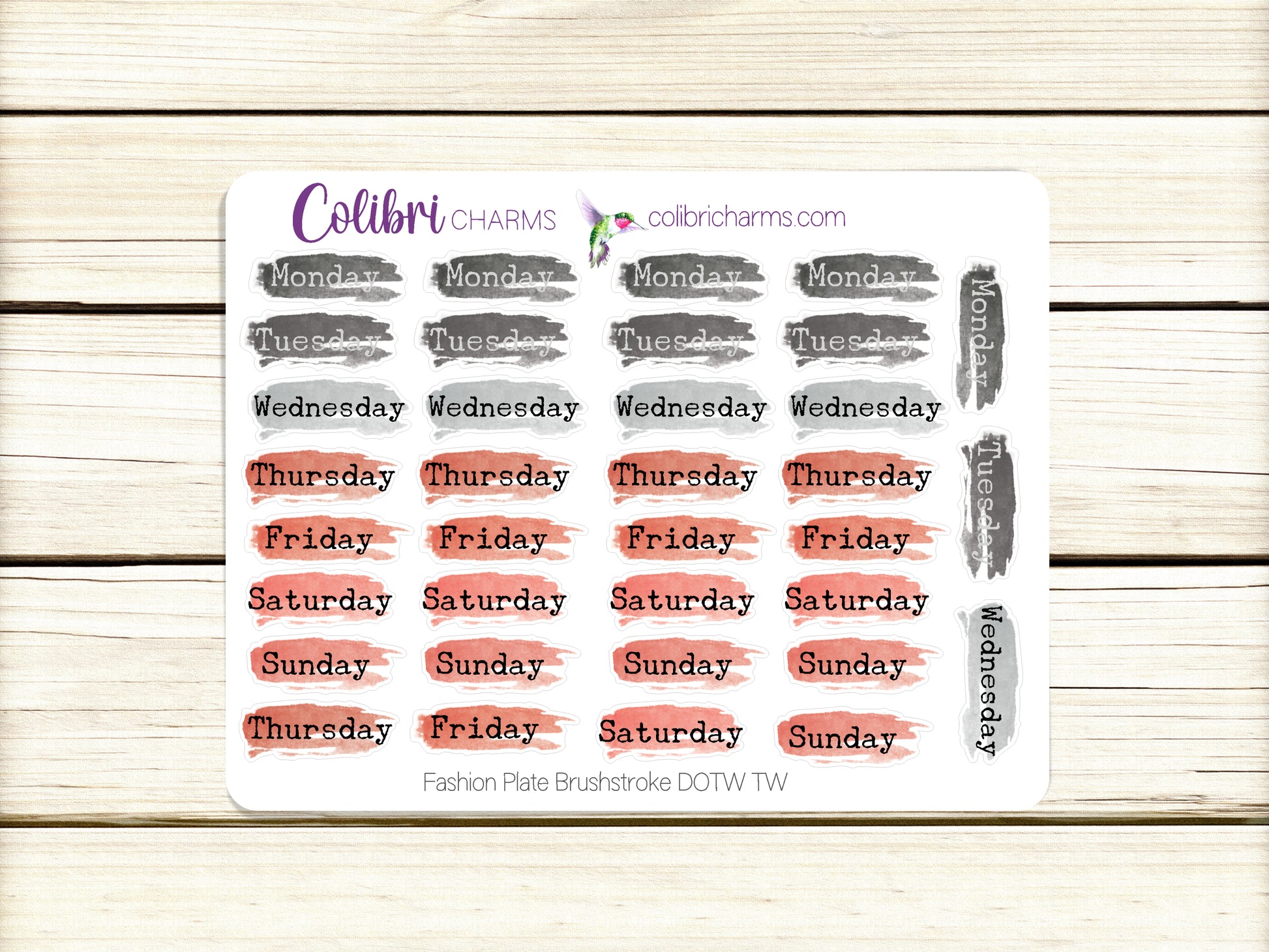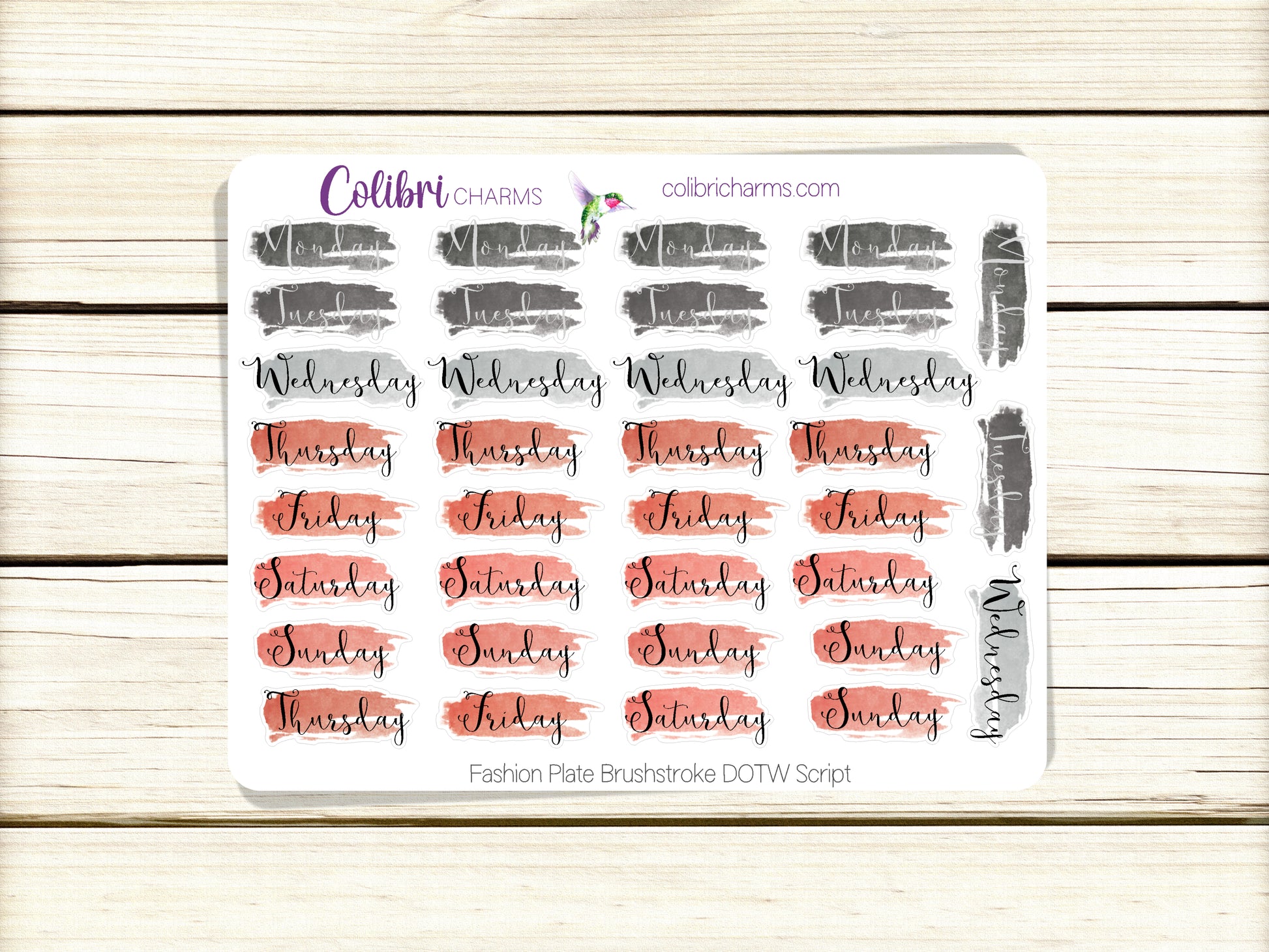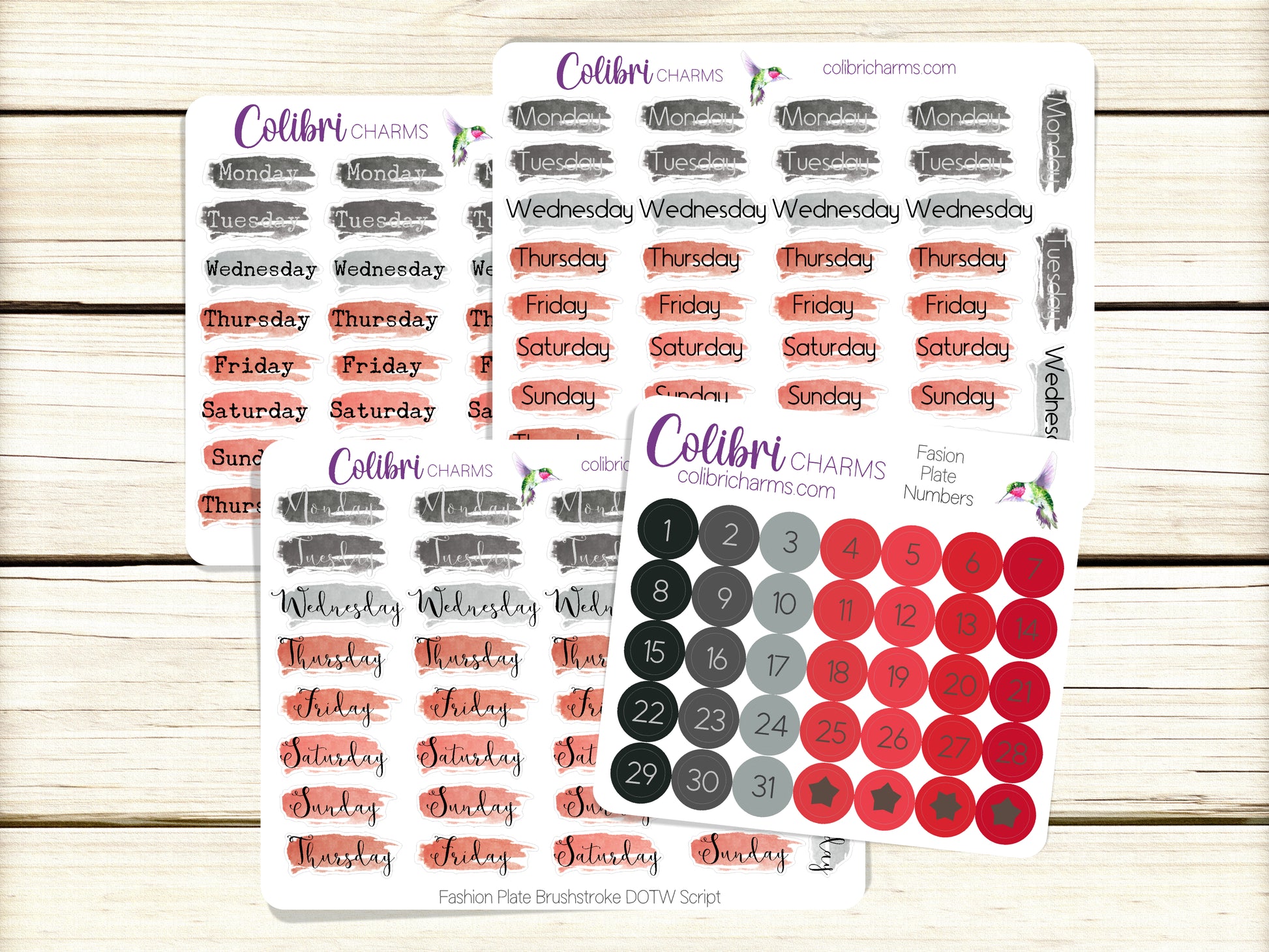 These lovely Days of the Week stickers come with five full weeks, so they work no matter your start day or when the month begins and ends. These colors are the perfect accompaniment for our Fashion Plate collection. Available in modern, script, or typewriter fonts or as numbers. Buy all four and save!