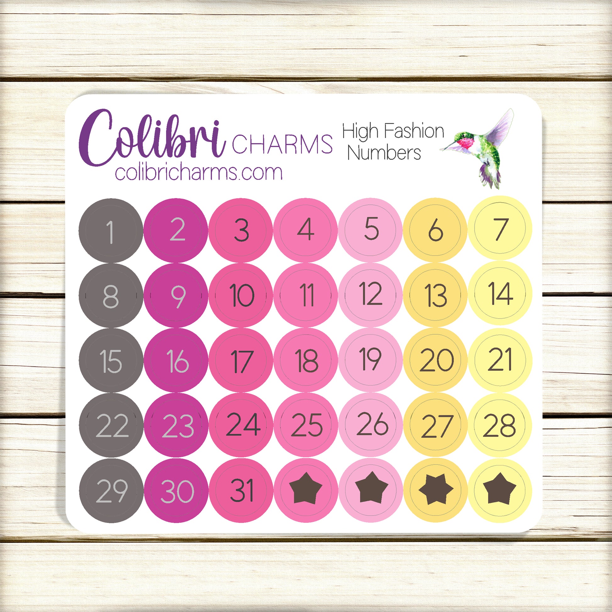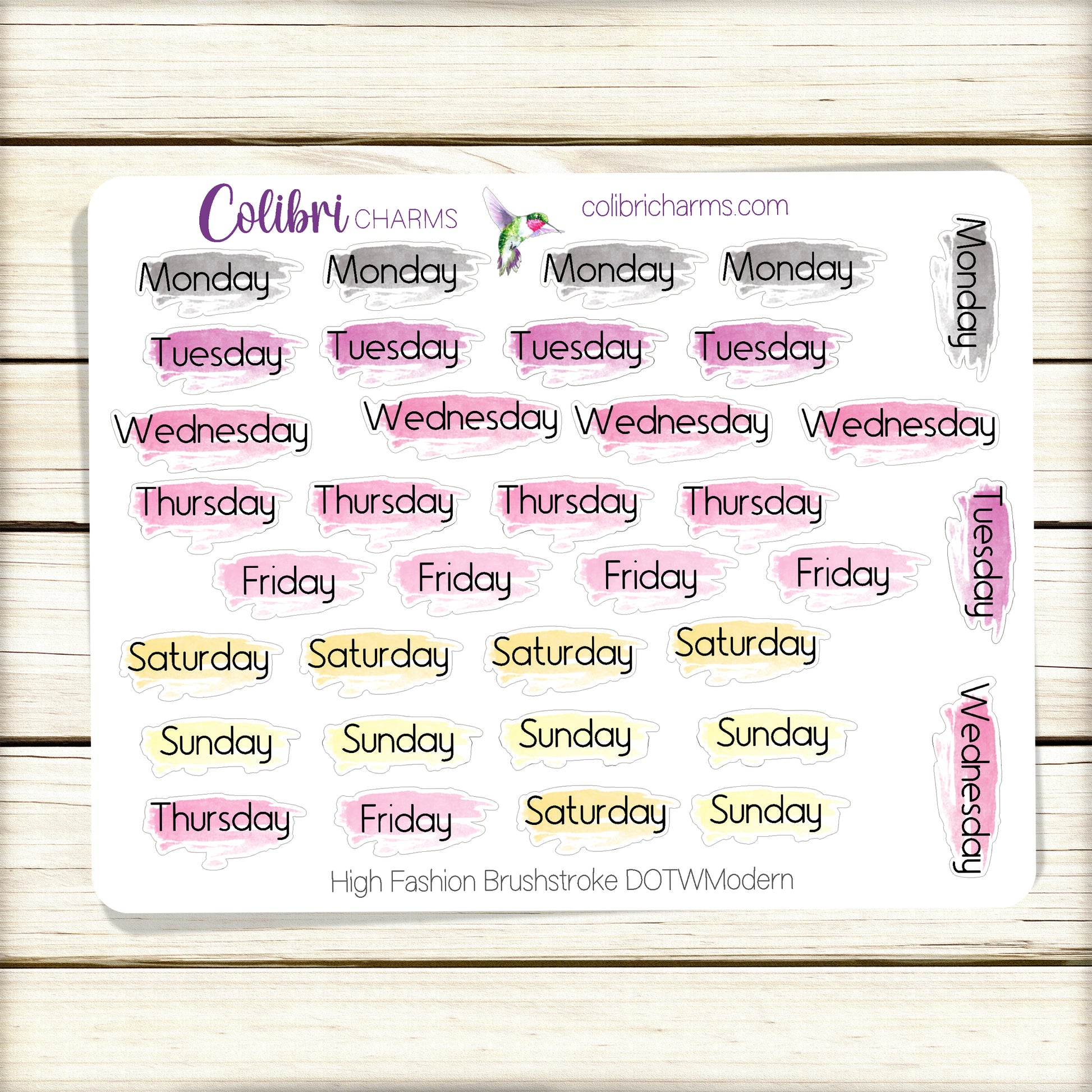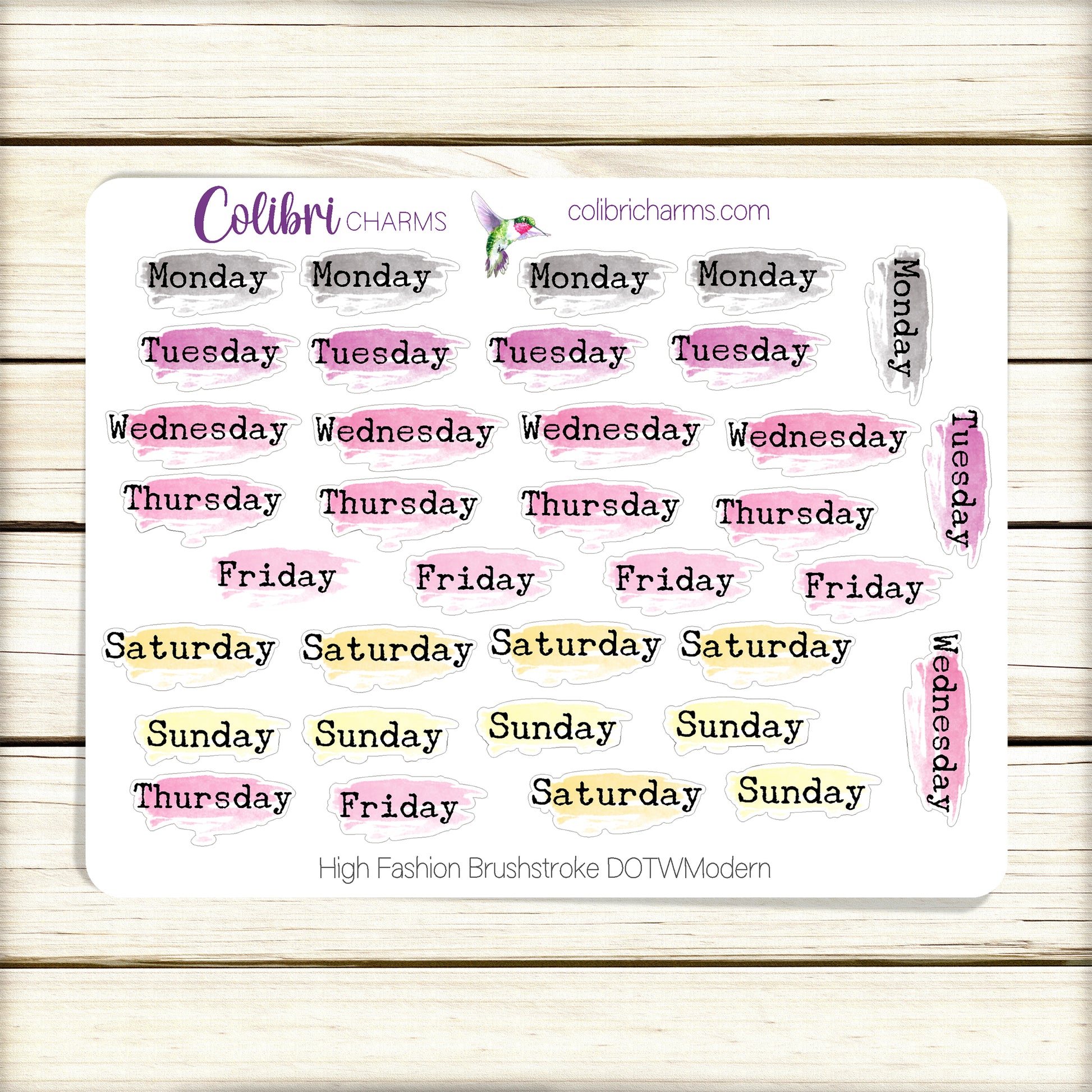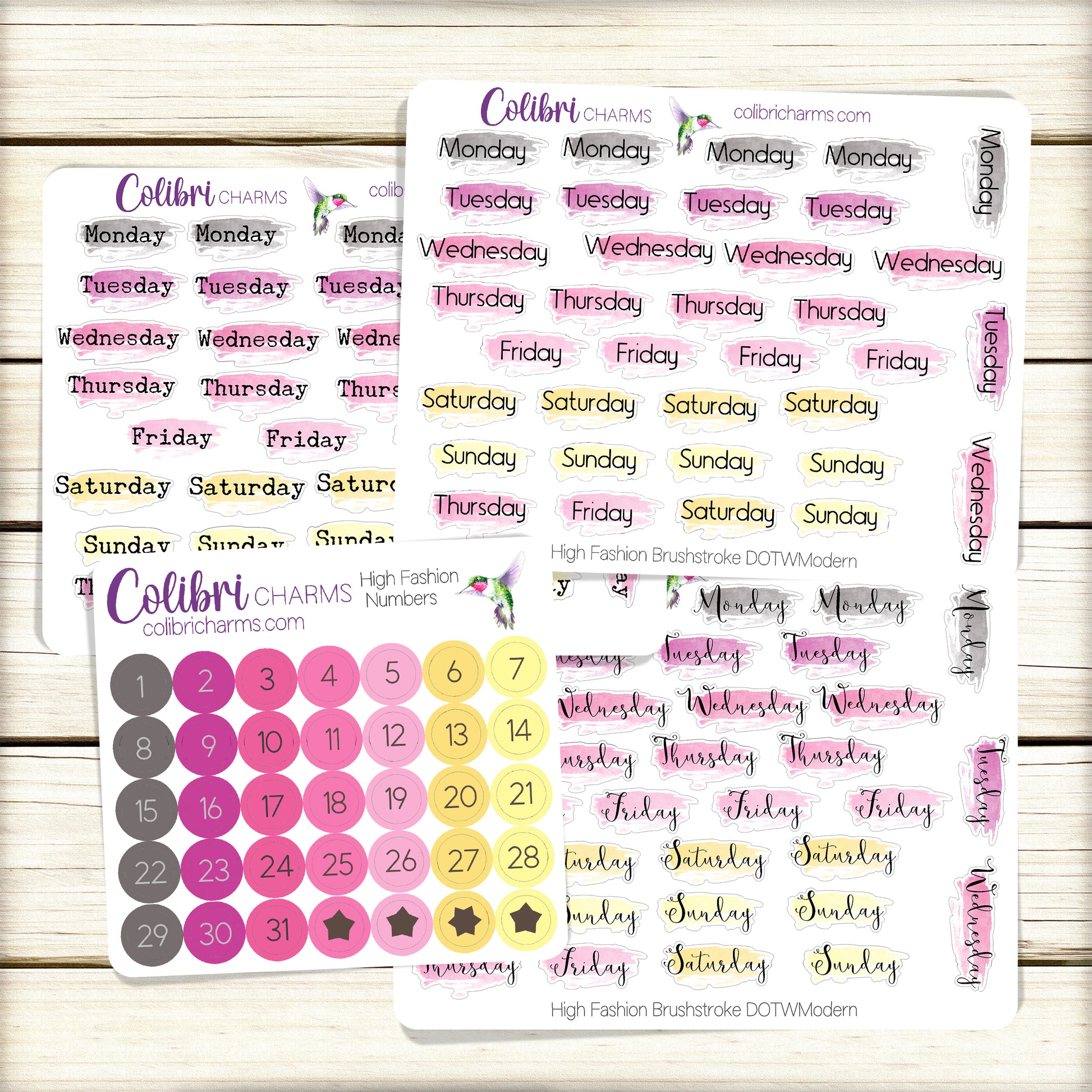 These lovely Days of the Week stickers come with five full weeks, so they work no matter your start day or when the month begins and ends. These bright colors are the perfect accompaniment for our High Fashion collection. Available in modern, script or typewriter fonts or as numbers.