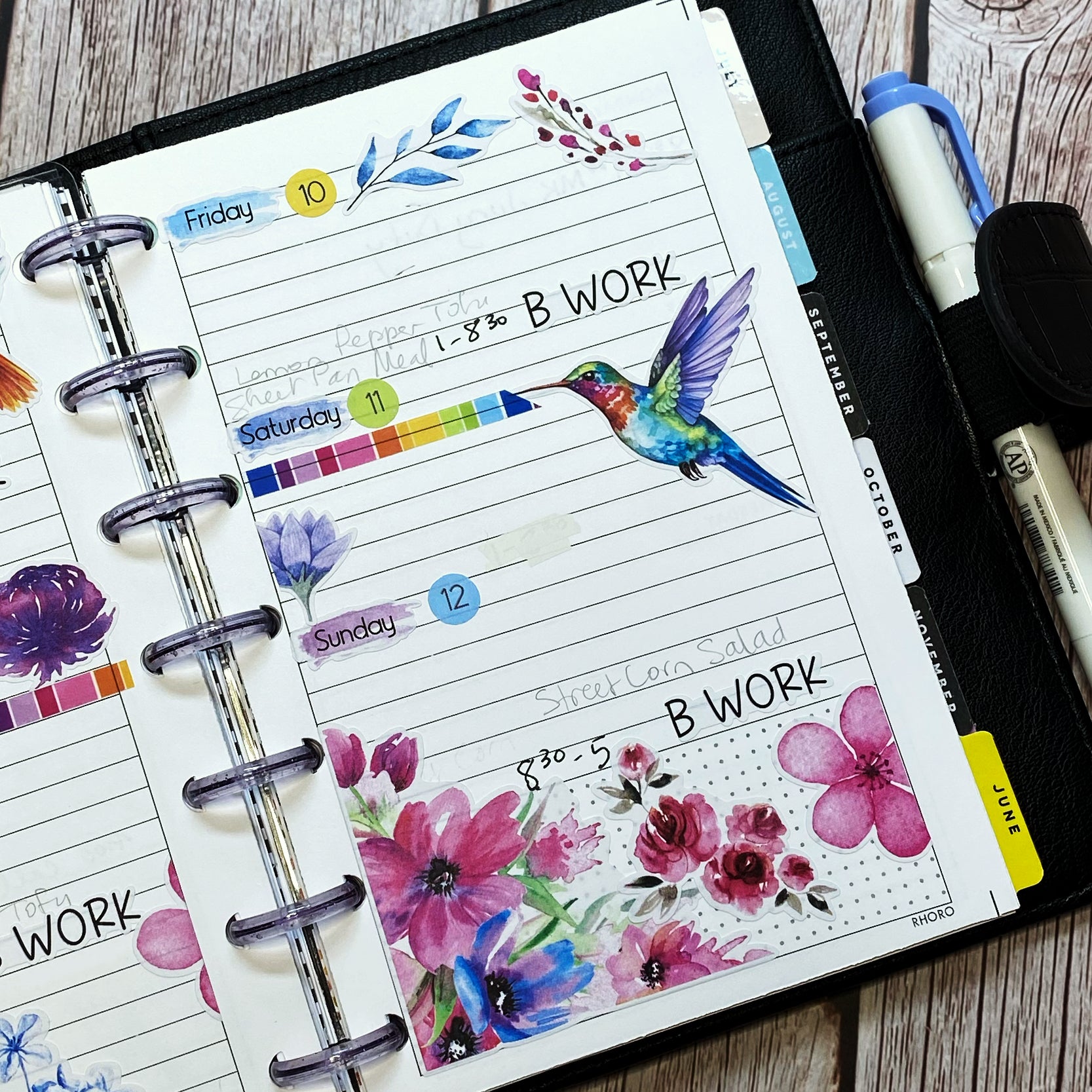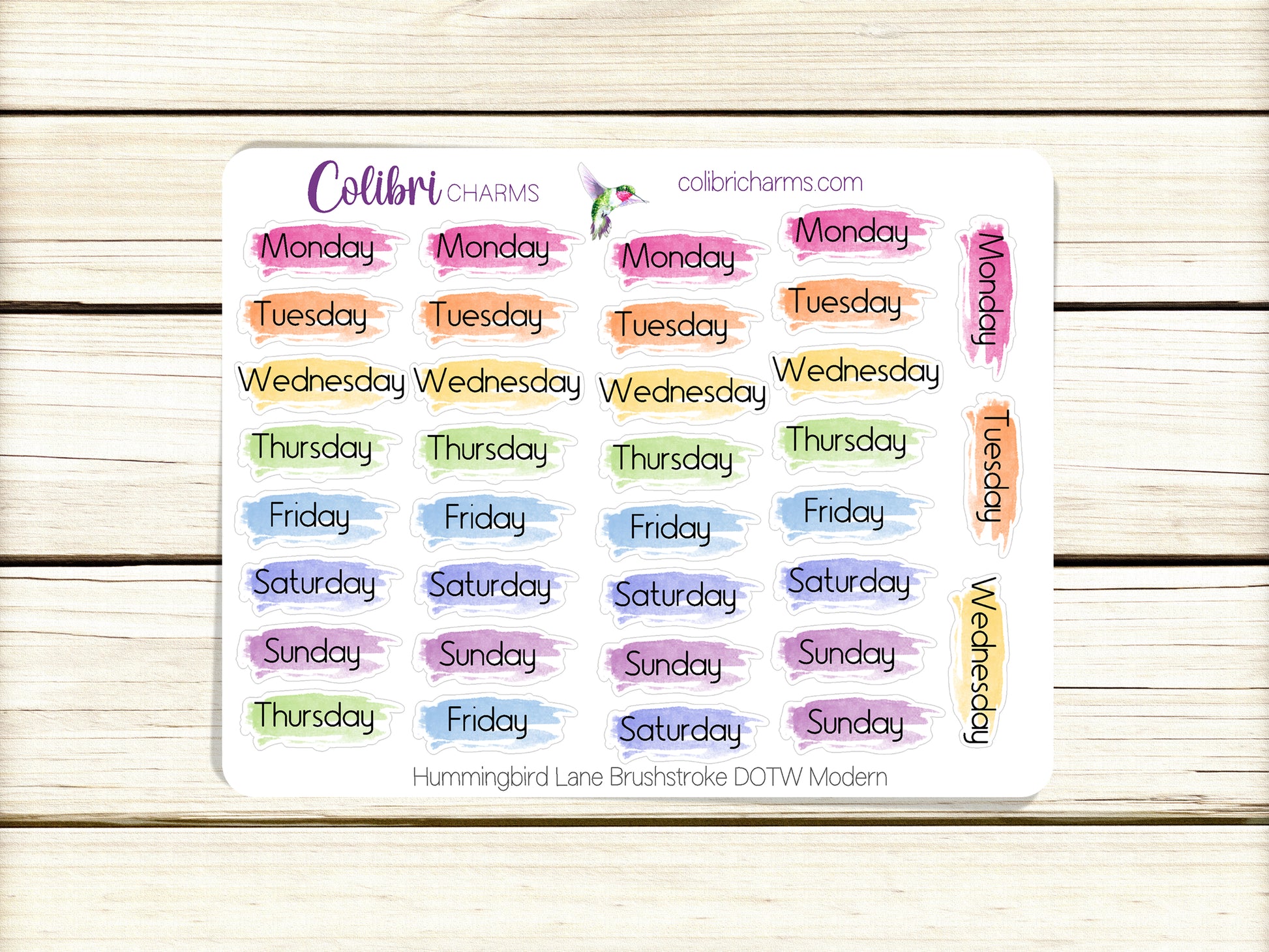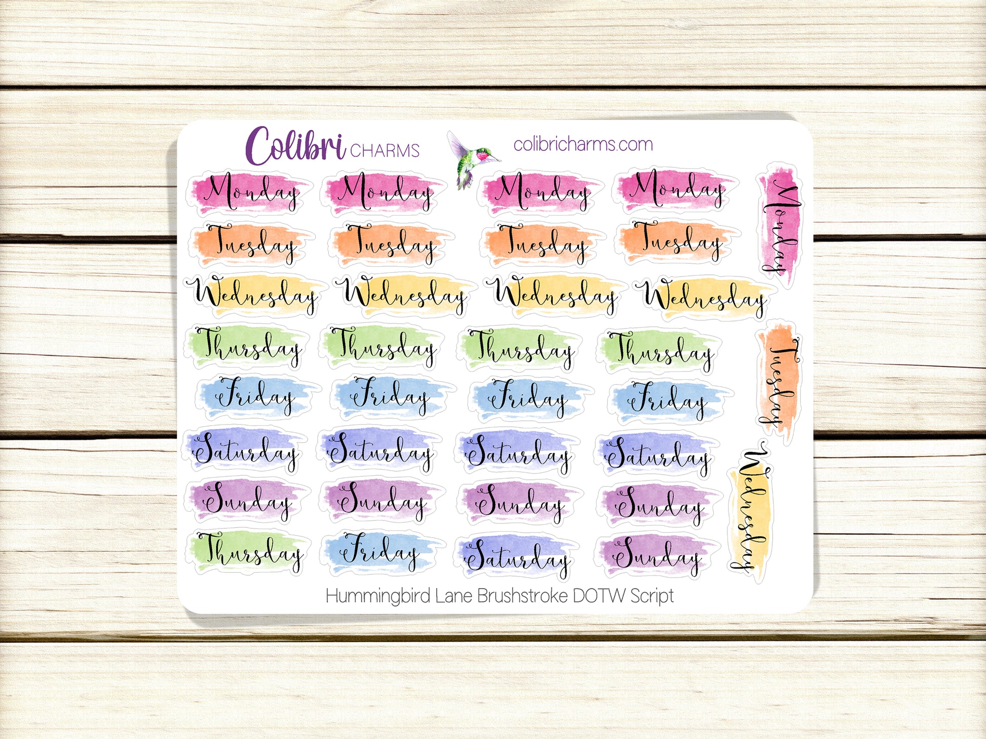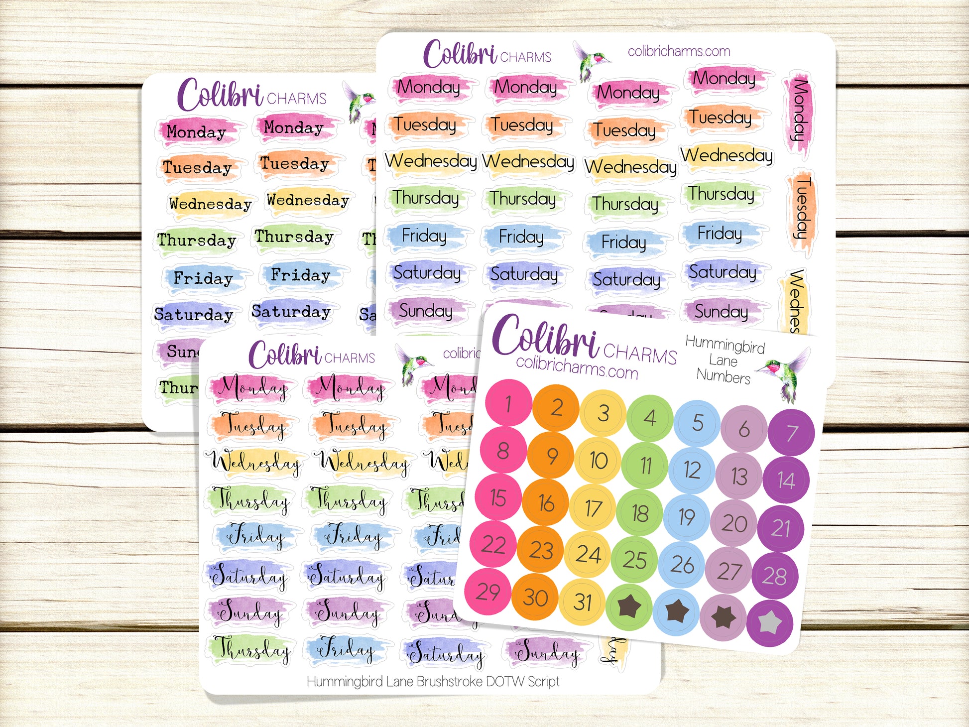 Hummingbird Lane Brushstroke Days of the Week Planner Stickers | Colorful Watercolor DOTW | Number Stickers | Date Dots