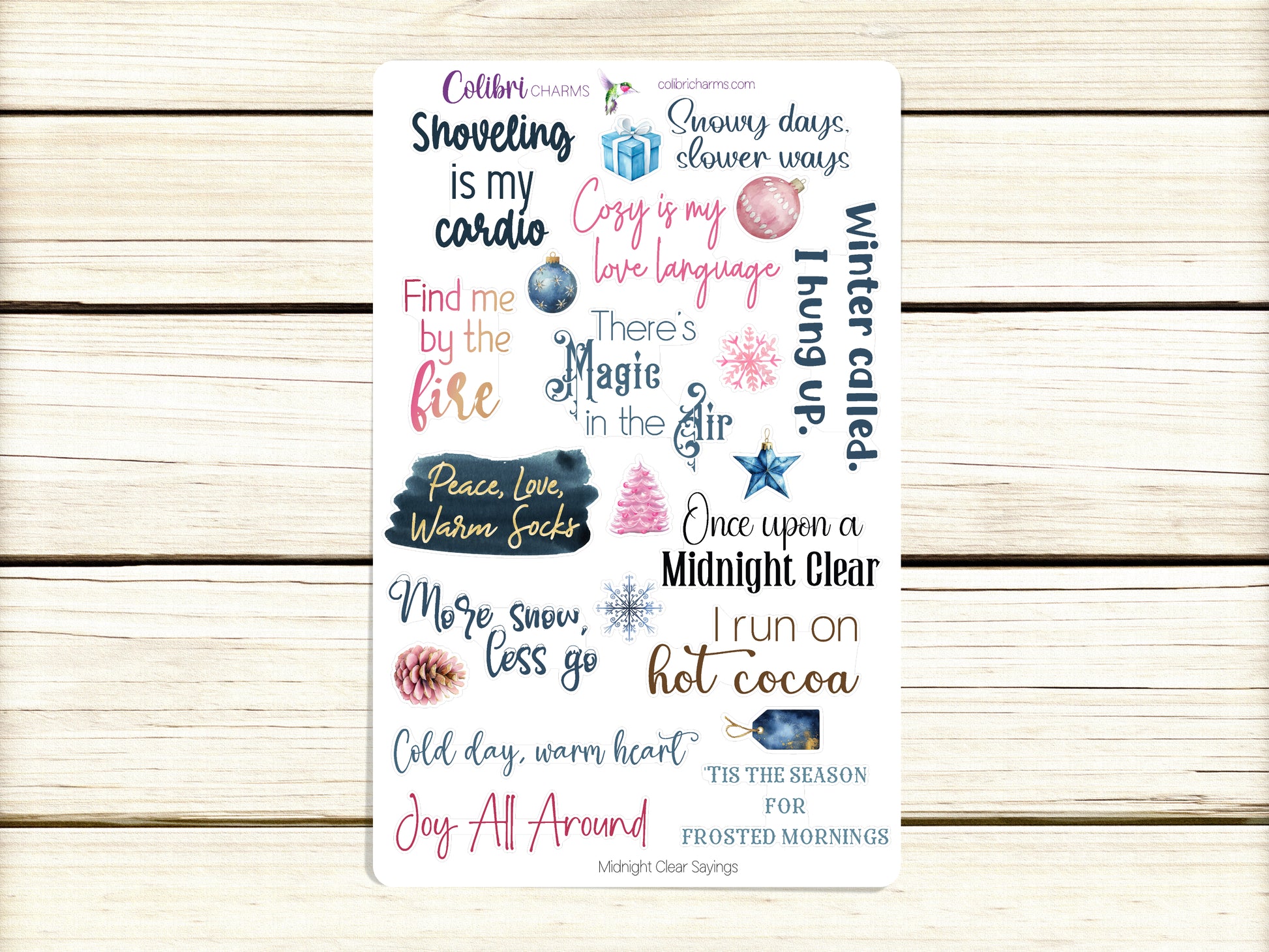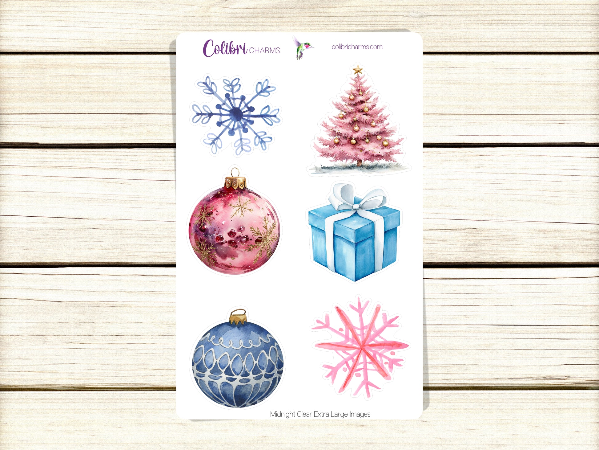 This set of journaling stickers is part of our pink and navy Christmas-themed collection, Midnight Clear. Including deco, torn paper, day of the week labels, washi and journaling spot stickers, they will look great in your planner, bullet journal, or scrapbook.