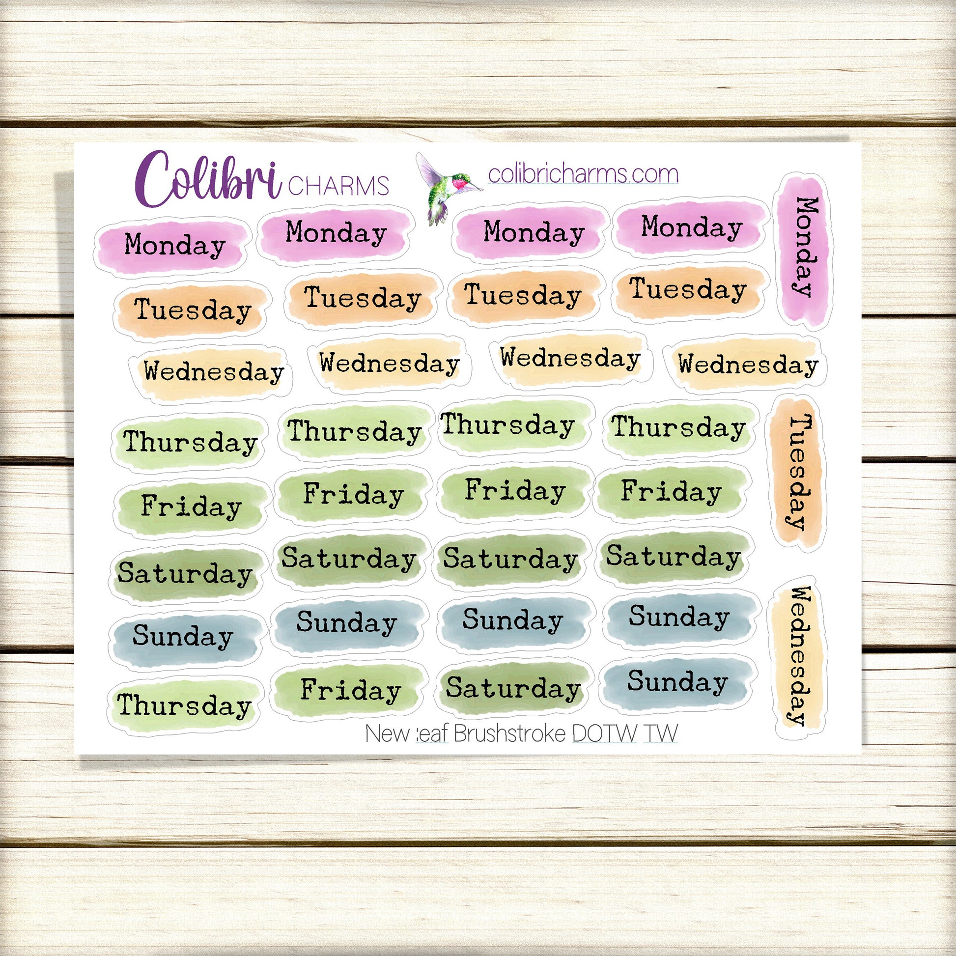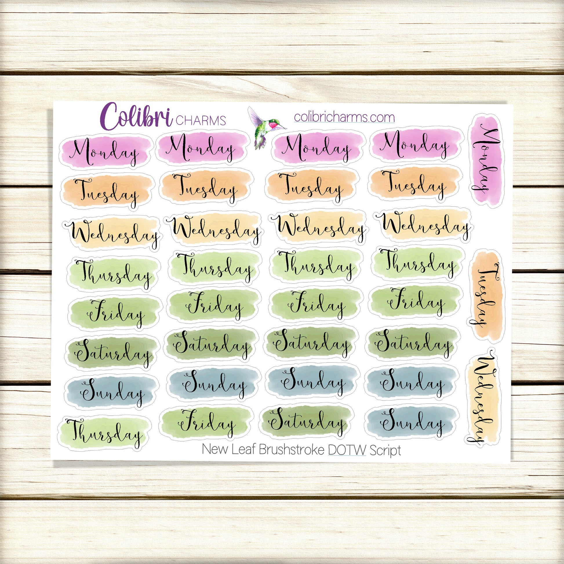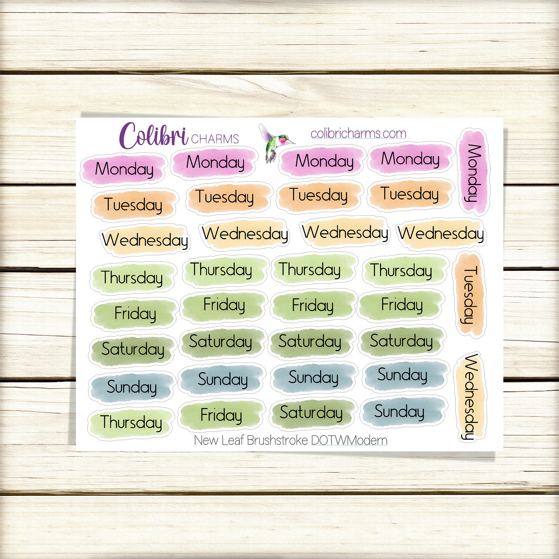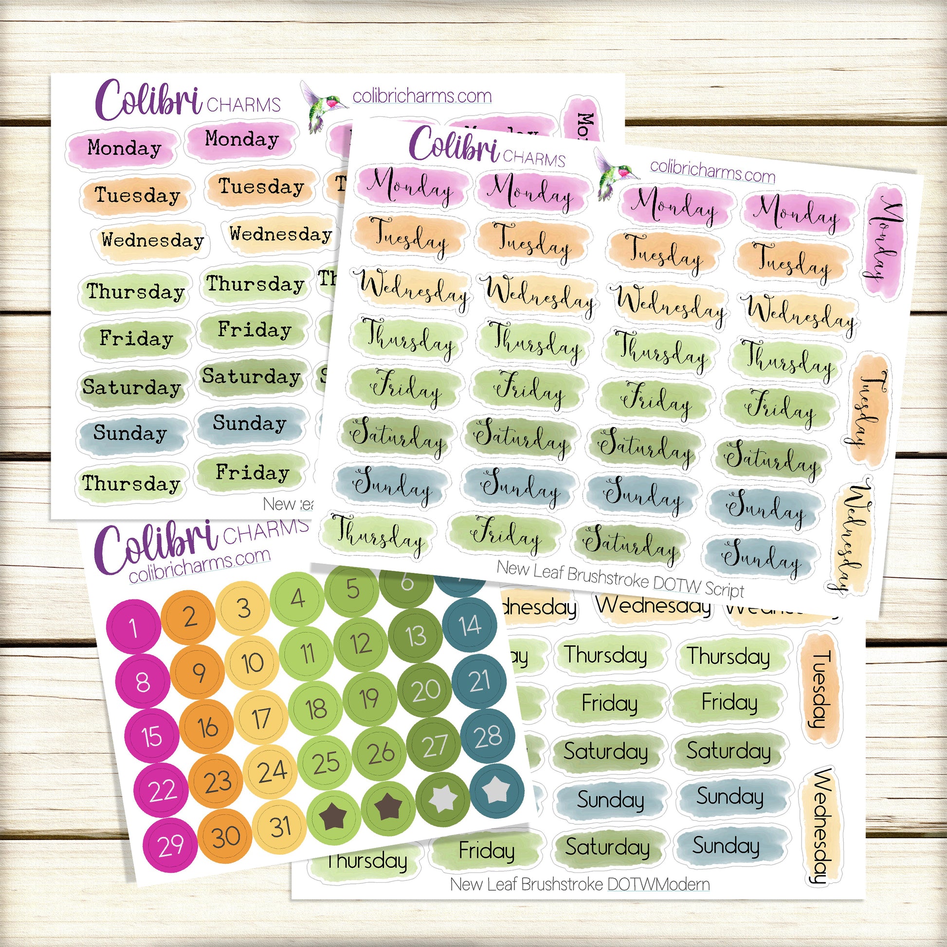 New Leaf Brushstroke Days of the Week Planner Stickers | Colorful Watercolor DOTW | Number Stickers | Date Dots