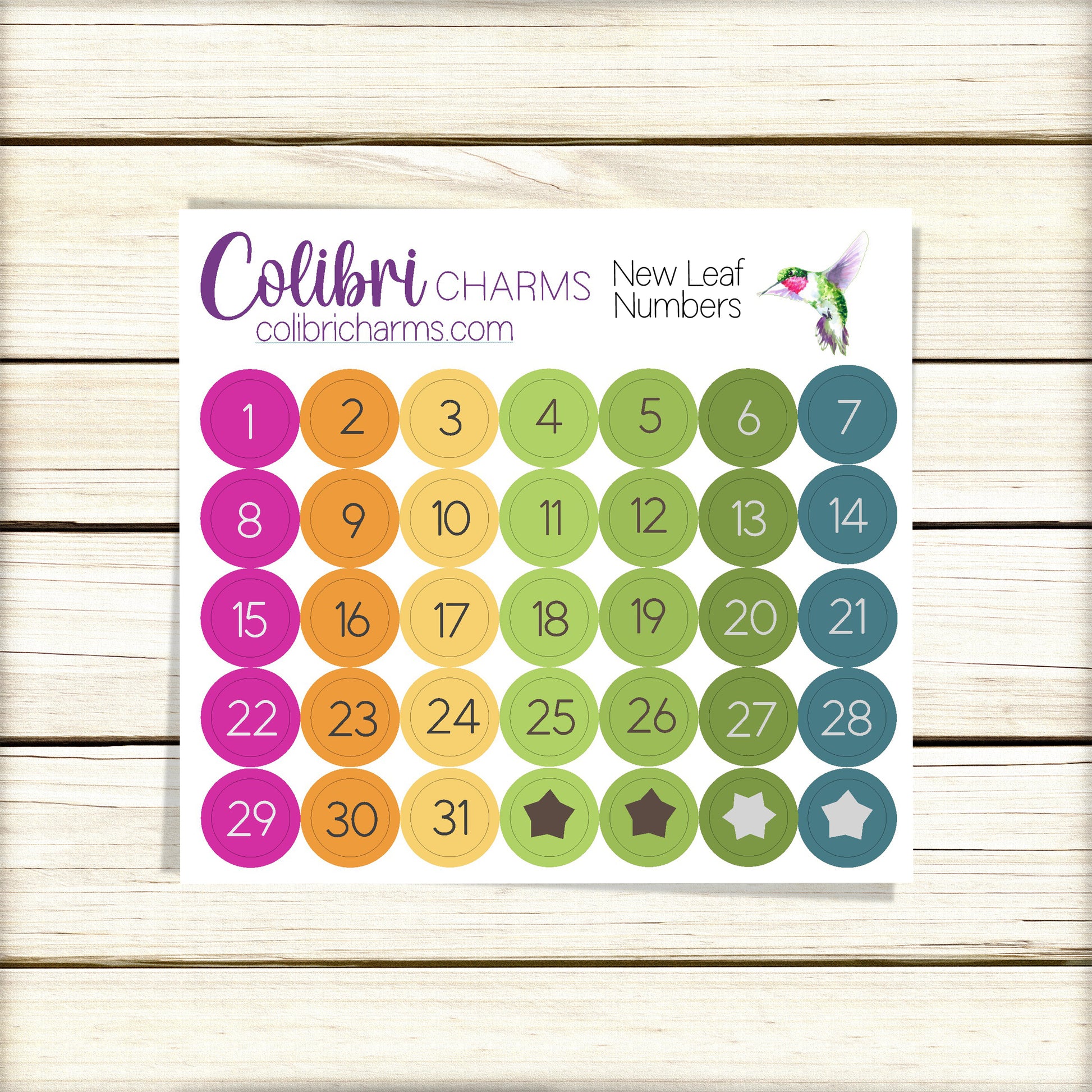 Individual day stickers are 3/4" to 1" wide. Numbers are 1cm wide.