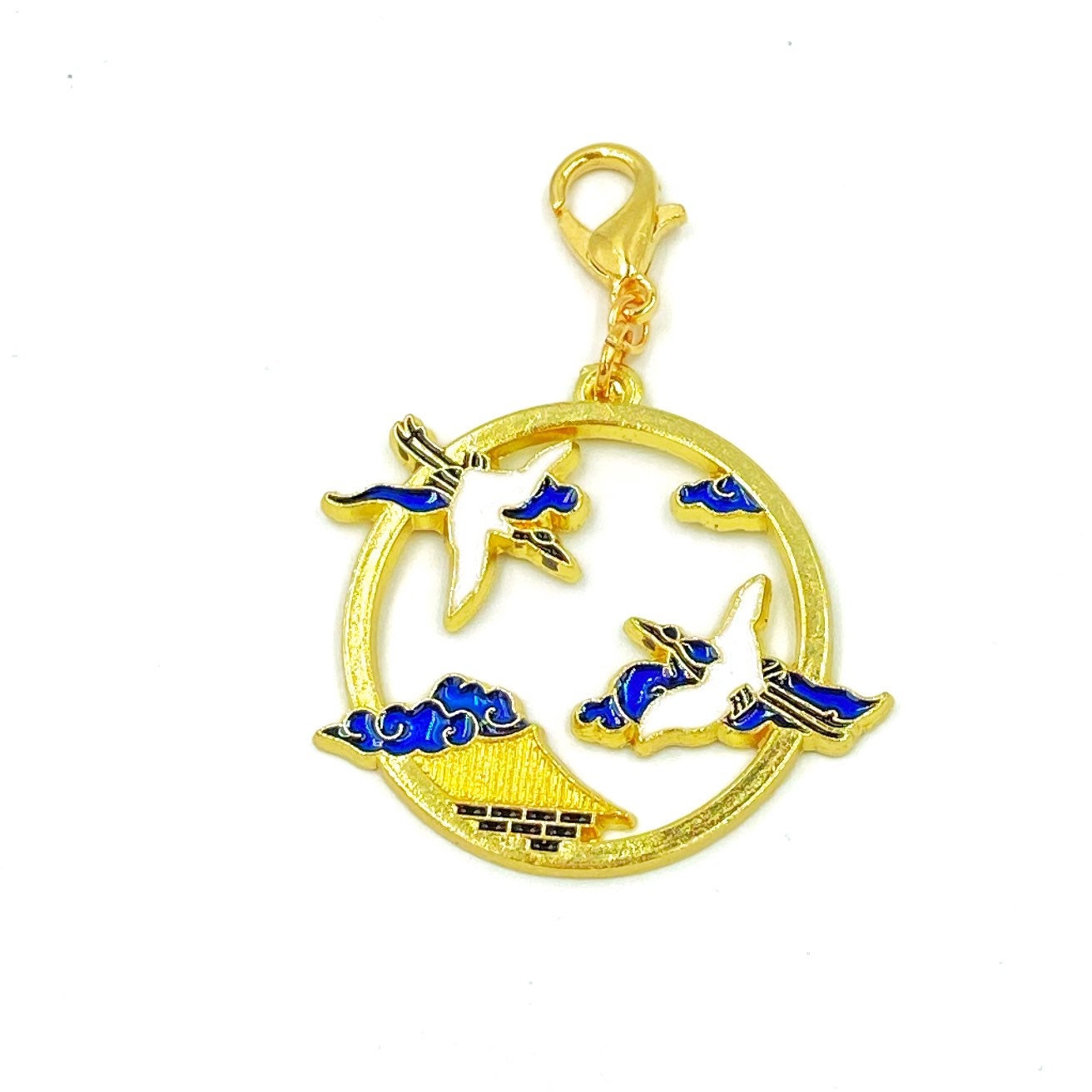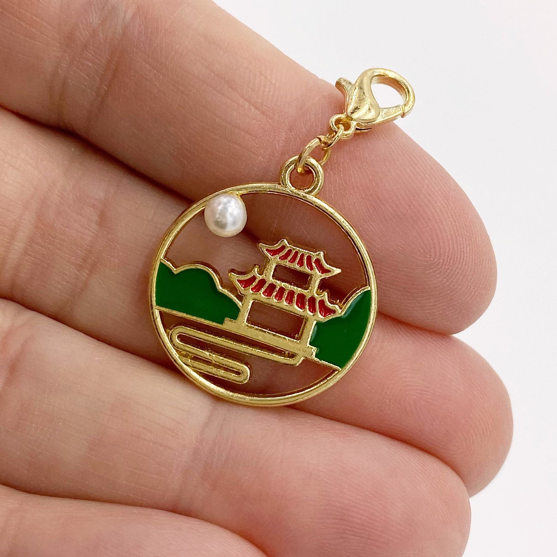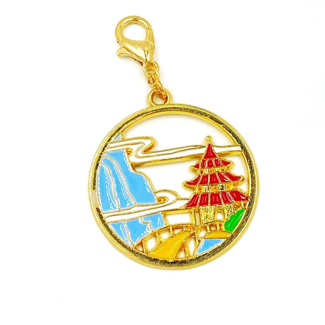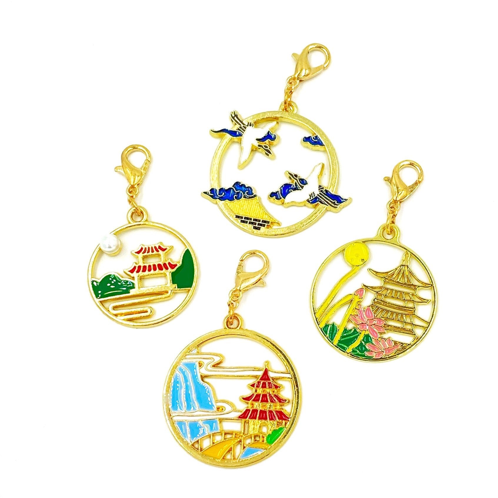 These little circle charms are charming and fun, with pagodas and cranes. They're the perfect adornment for your planner, badge reel, or knitting.