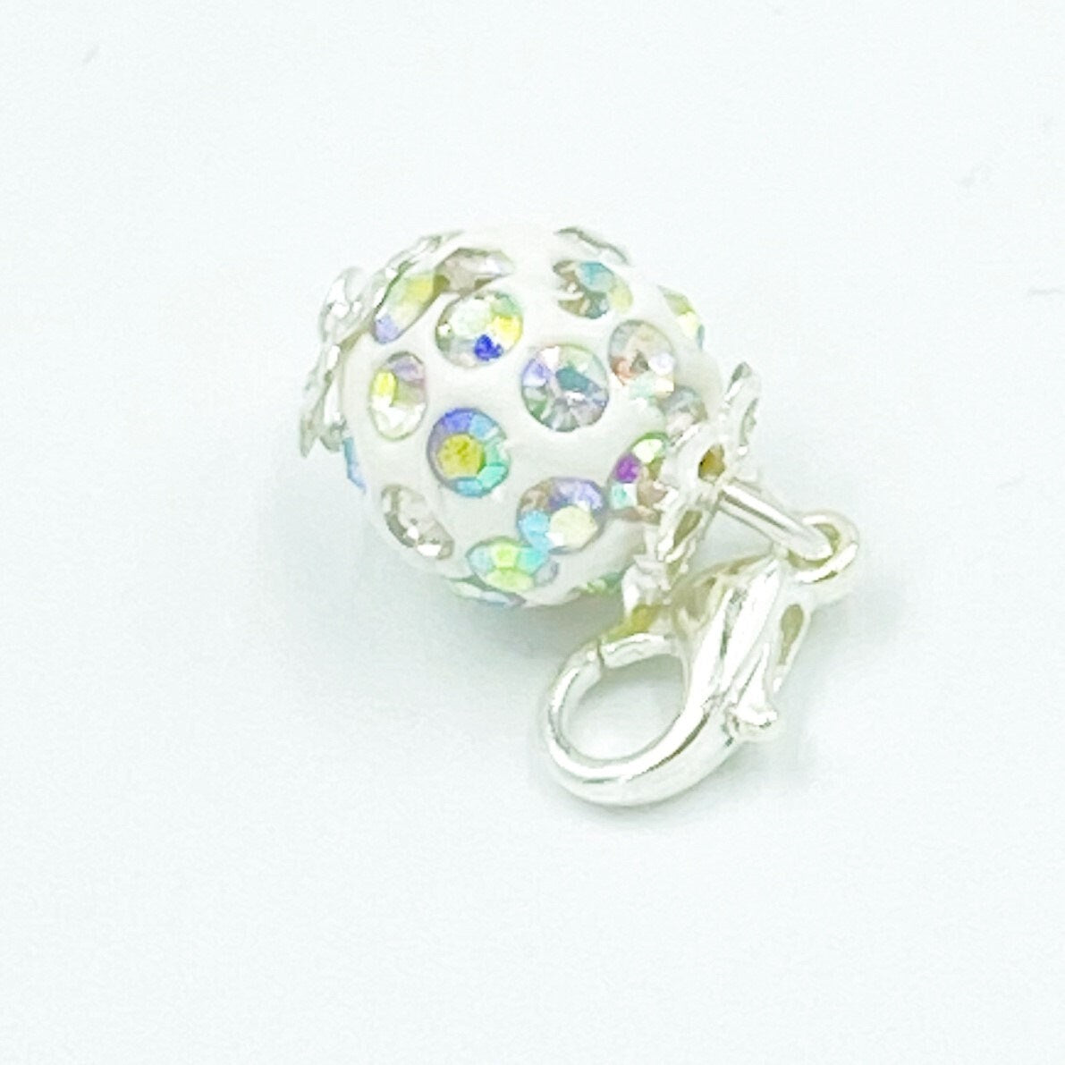 Small rhinestone dangle charms in fashionable tones with silver- or gold-tone lobster clasp. Clay bead with rhinestone pavé.