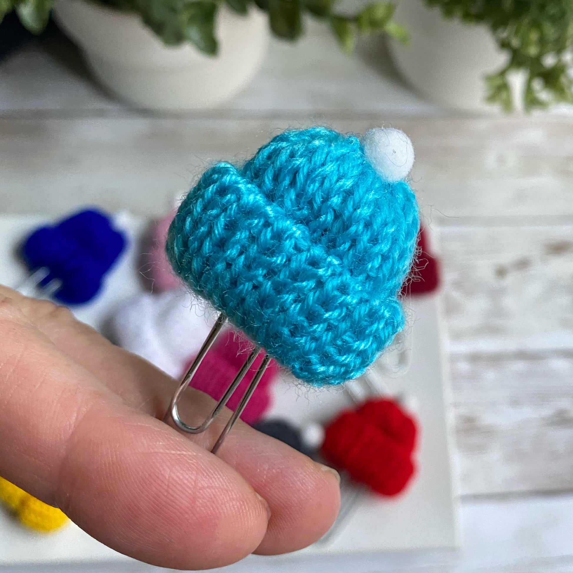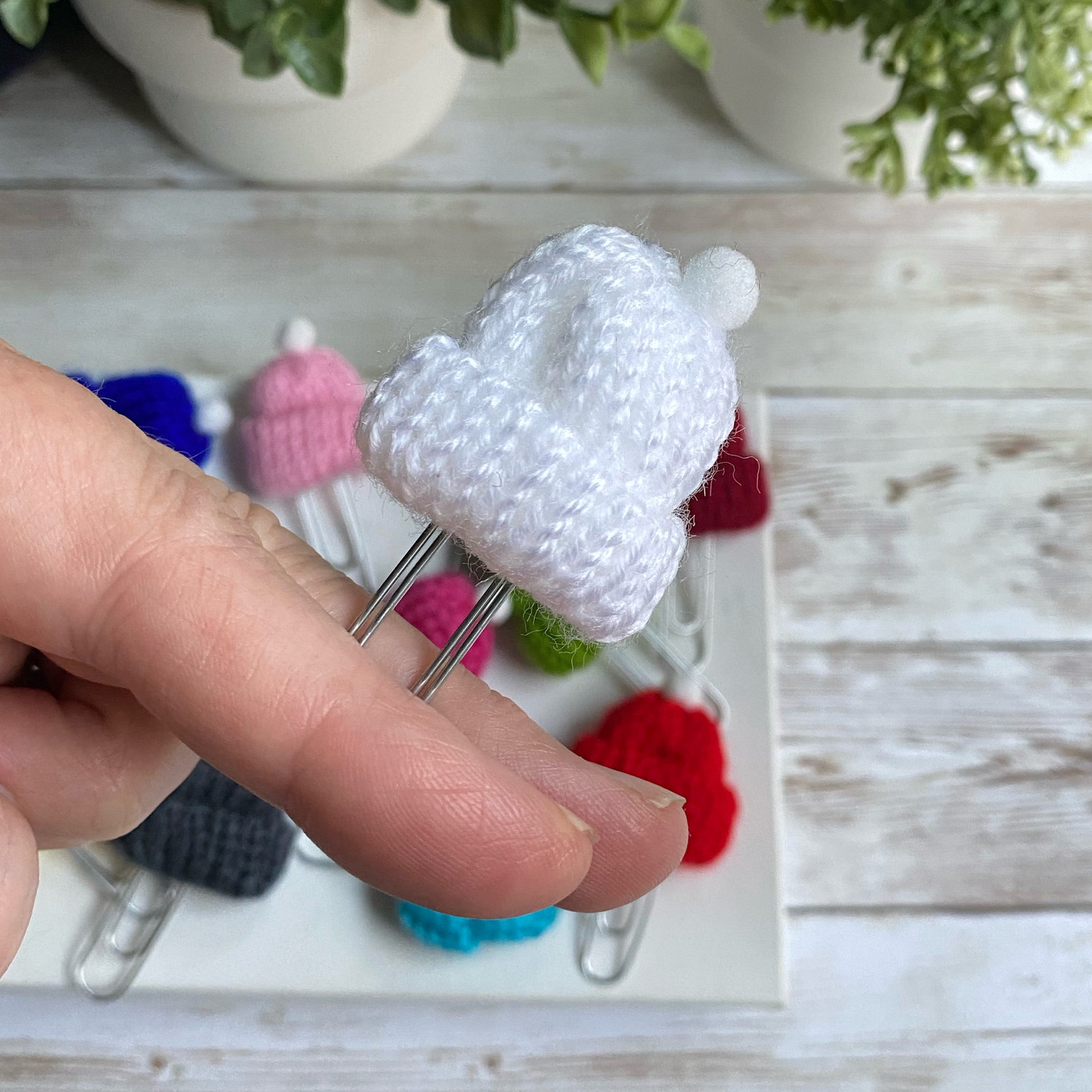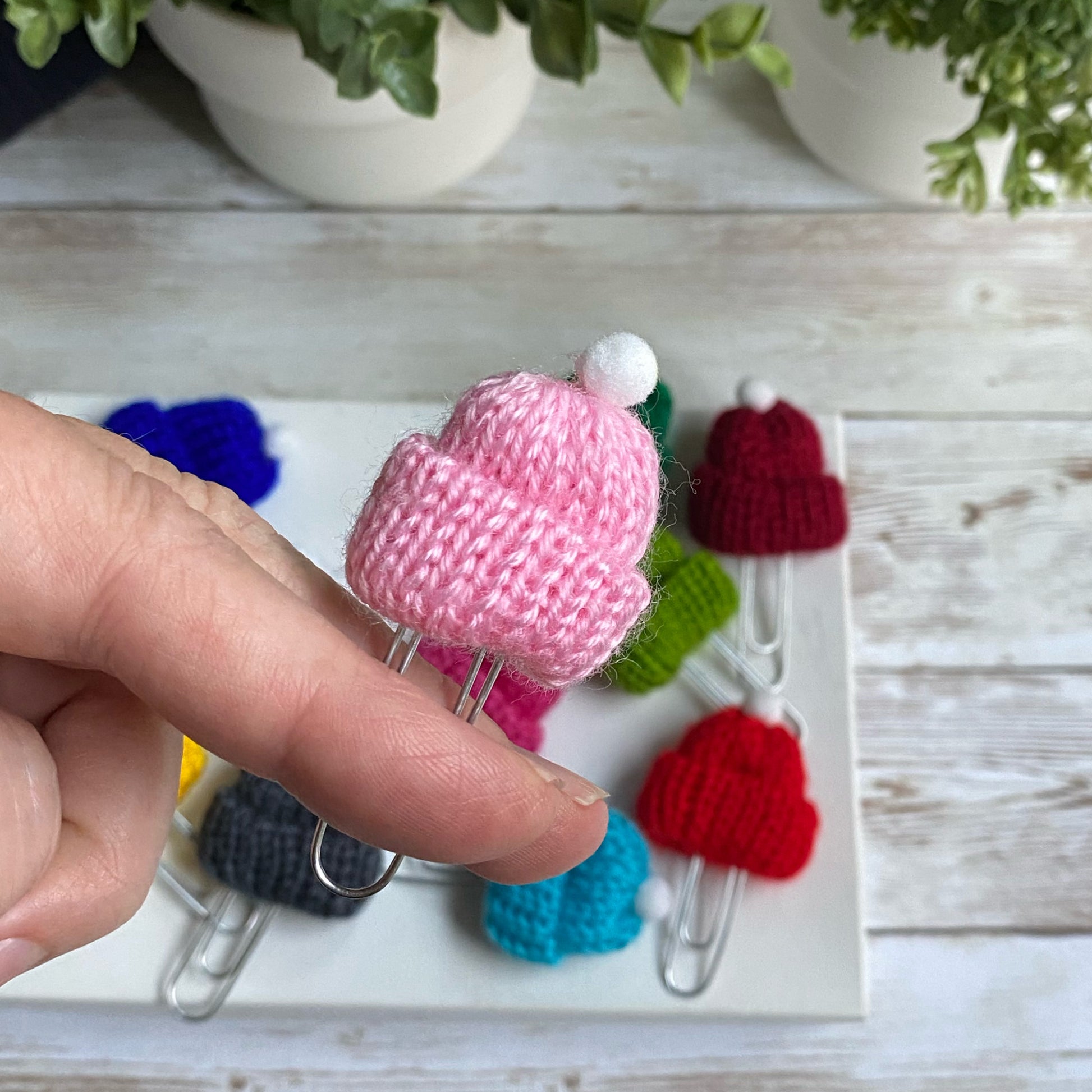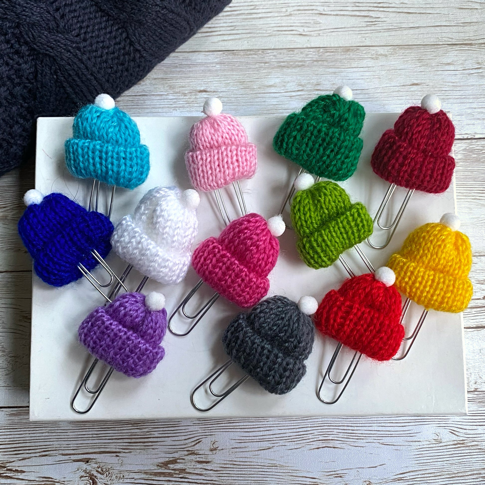 Add some whimsy to your winter planner setup with these little stocking cap clips with poms on top. Knit cap colors include bright pink, teal, burgundy, olive green, forest green, white, dark grey, yellow and red, all on a silver jumbo paper clip.