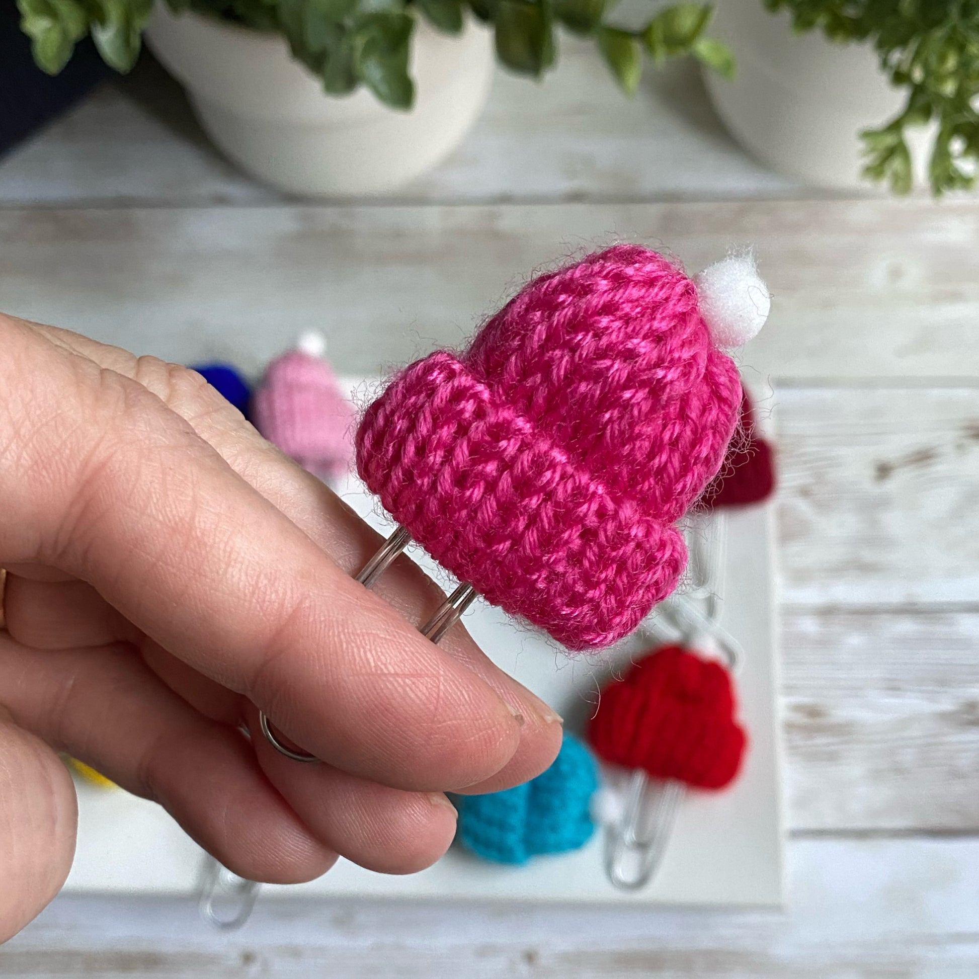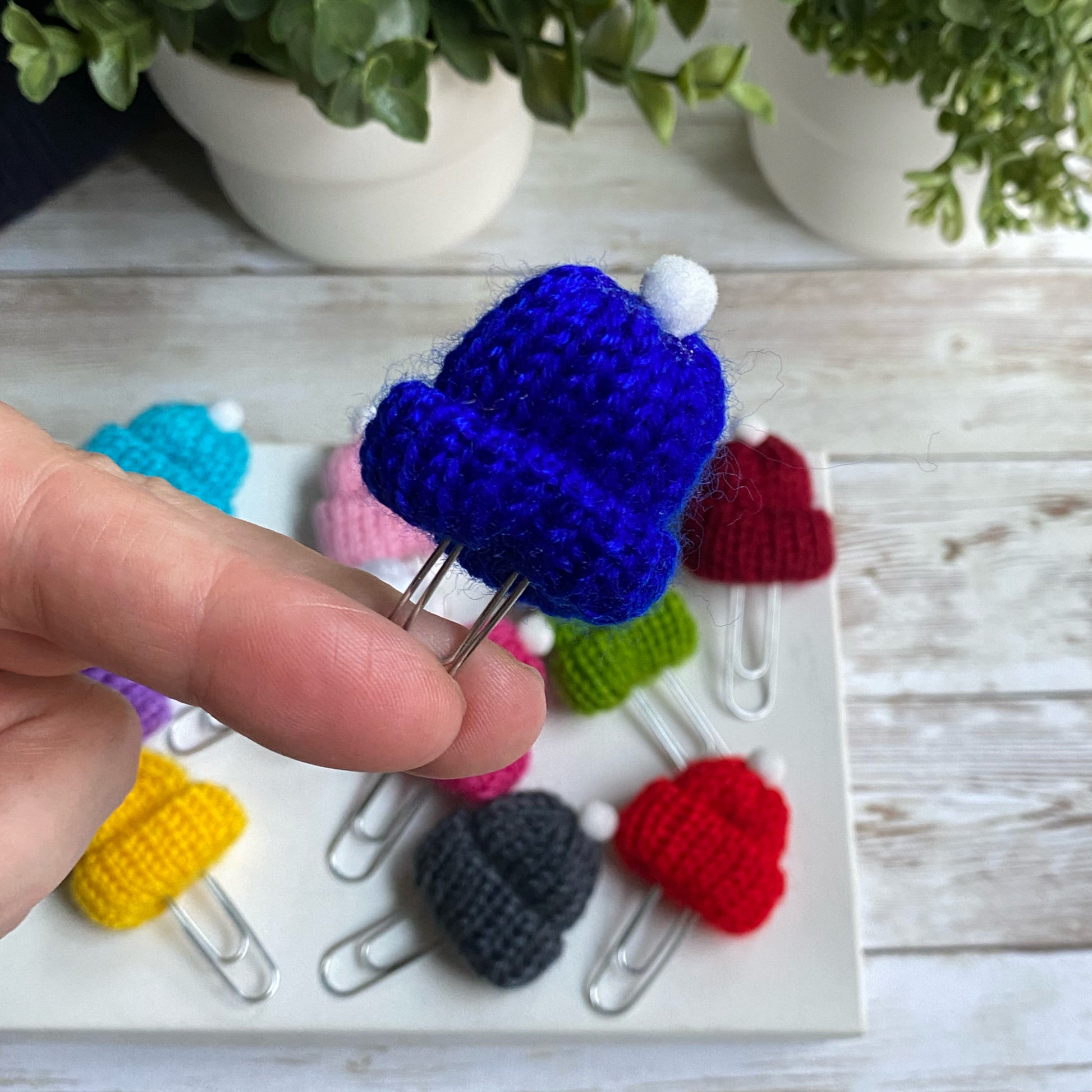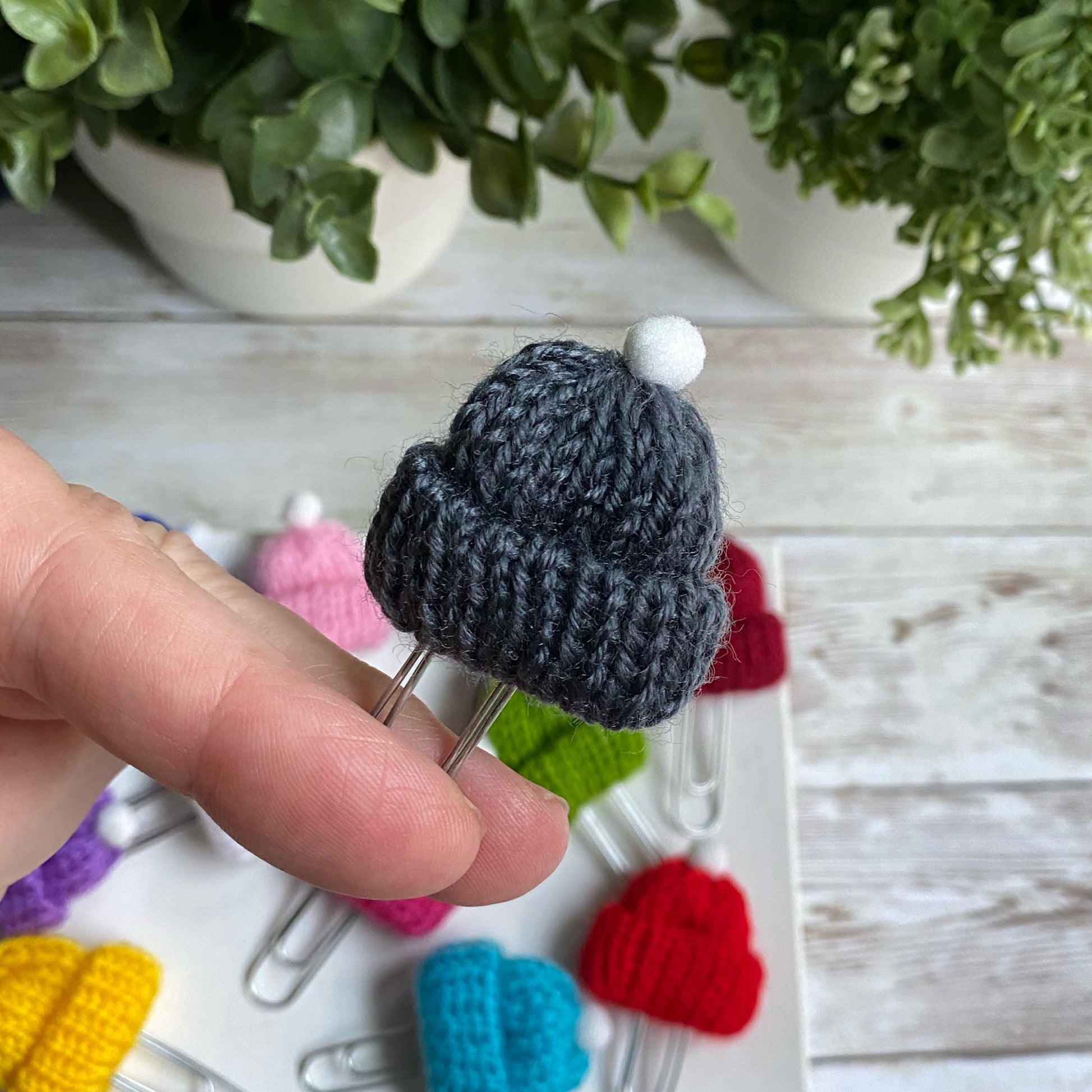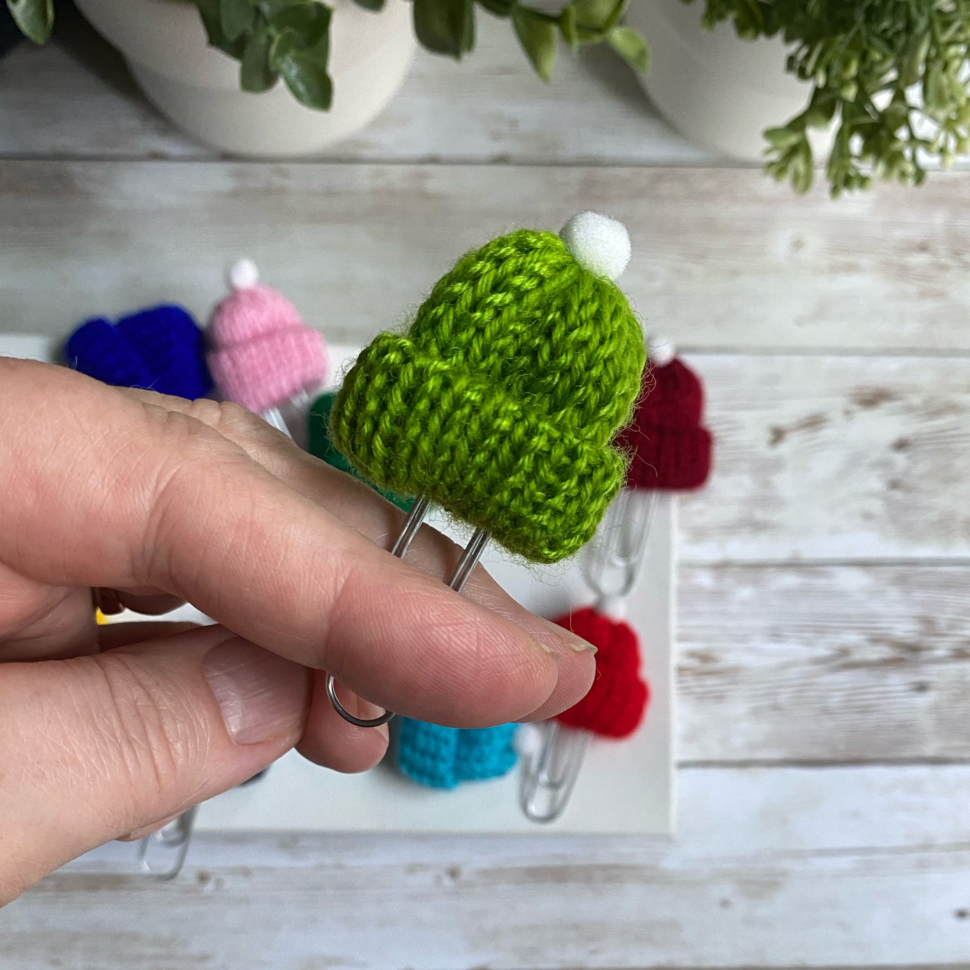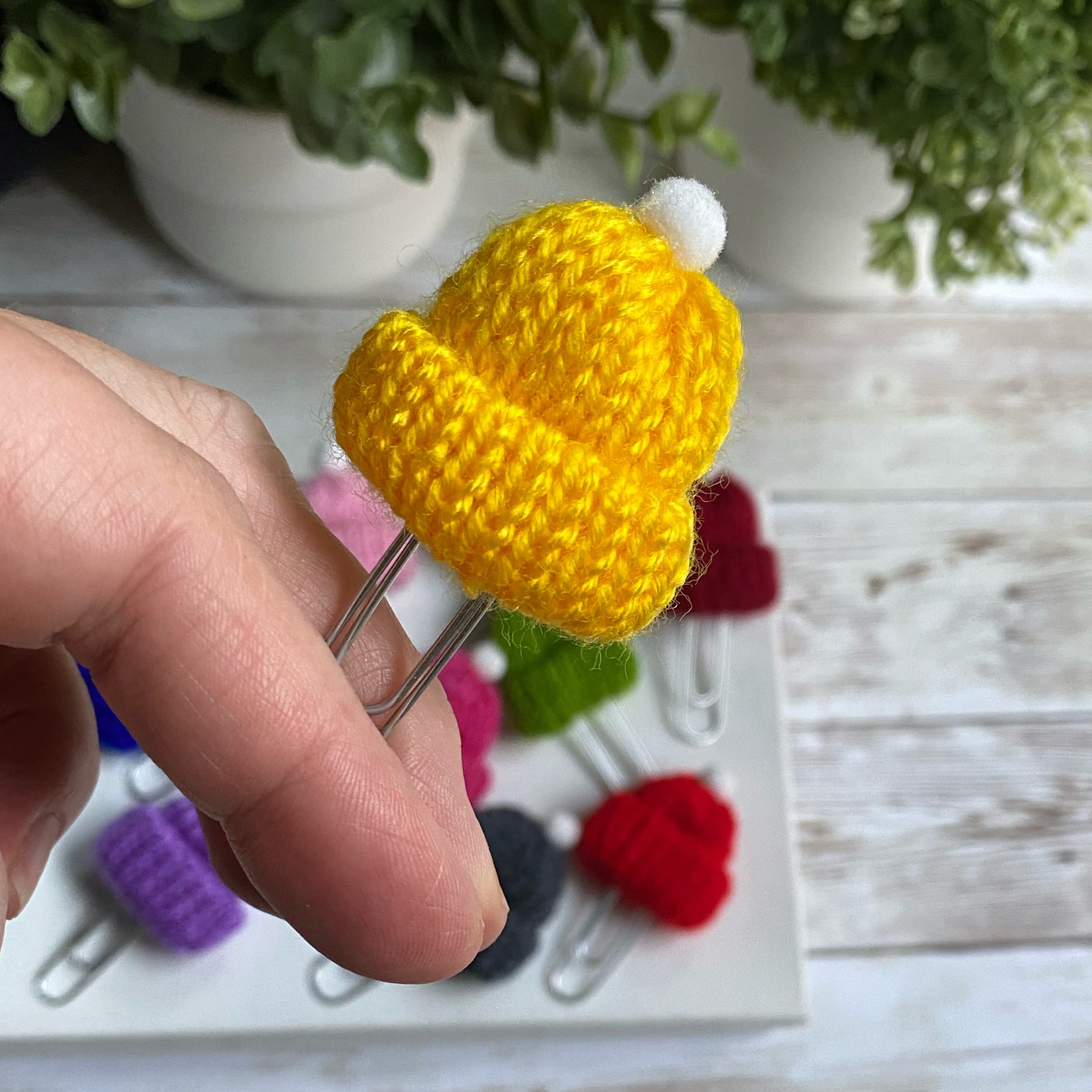Add some whimsy to your winter planner setup with these little stocking cap clips with poms on top. Knit cap colors include bright pink, teal, burgundy, olive green, forest green, white, dark grey, yellow and red, all on a silver jumbo paper clip.