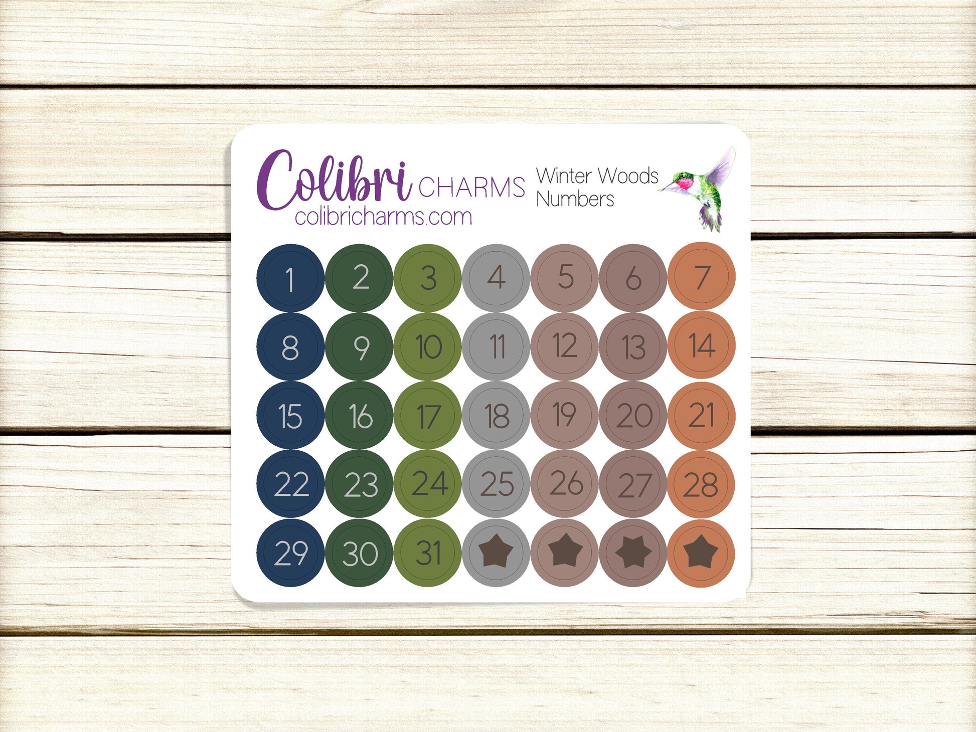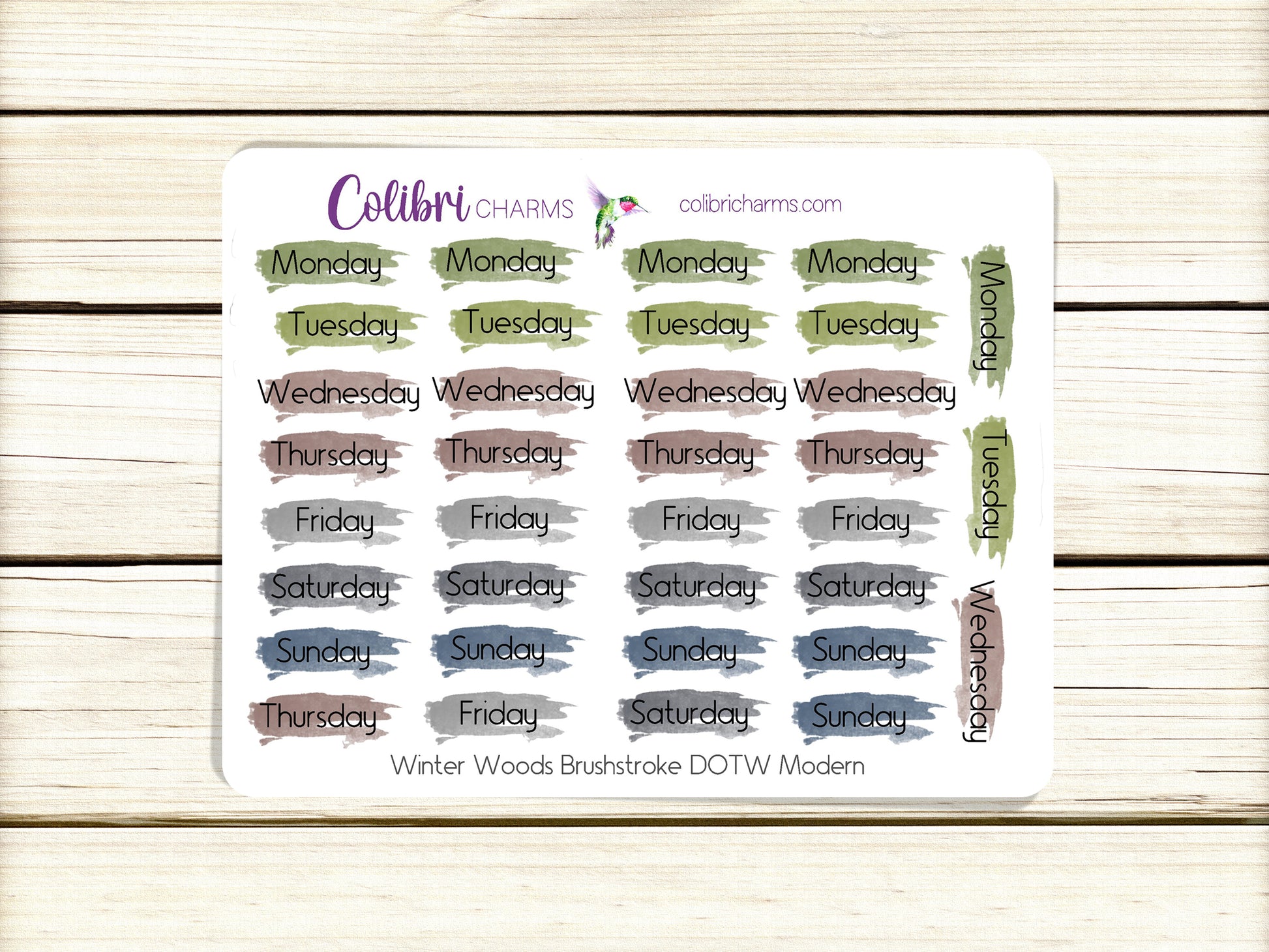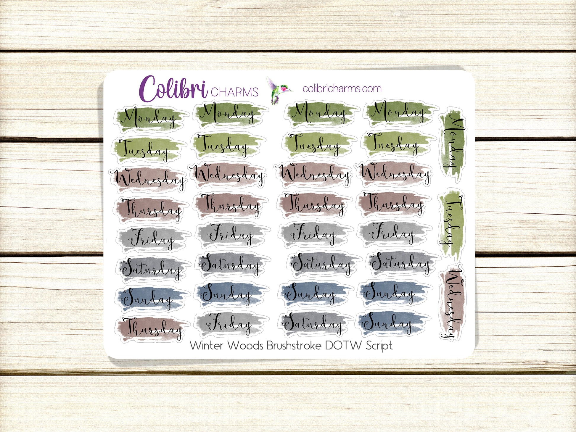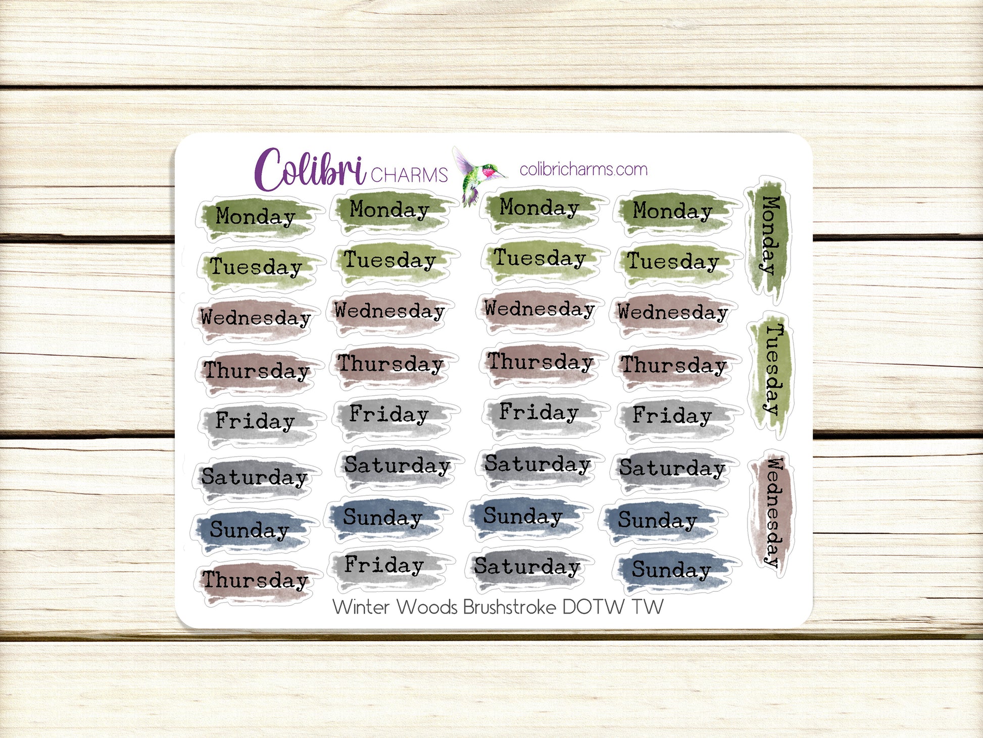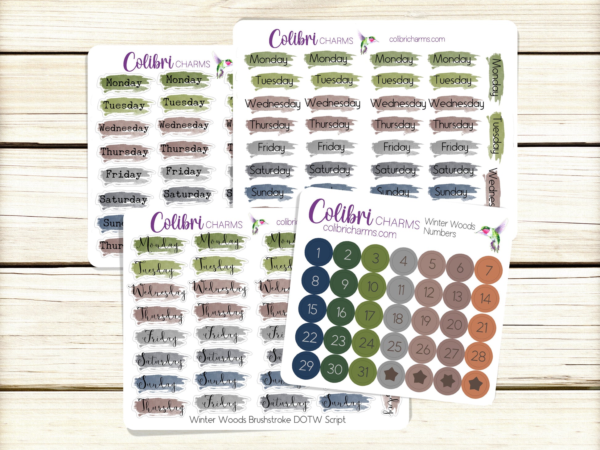 Winter Woods Brushstroke Days of the Week Planner Stickers | Colorful Watercolor DOTW | Number Stickers | Date Dots