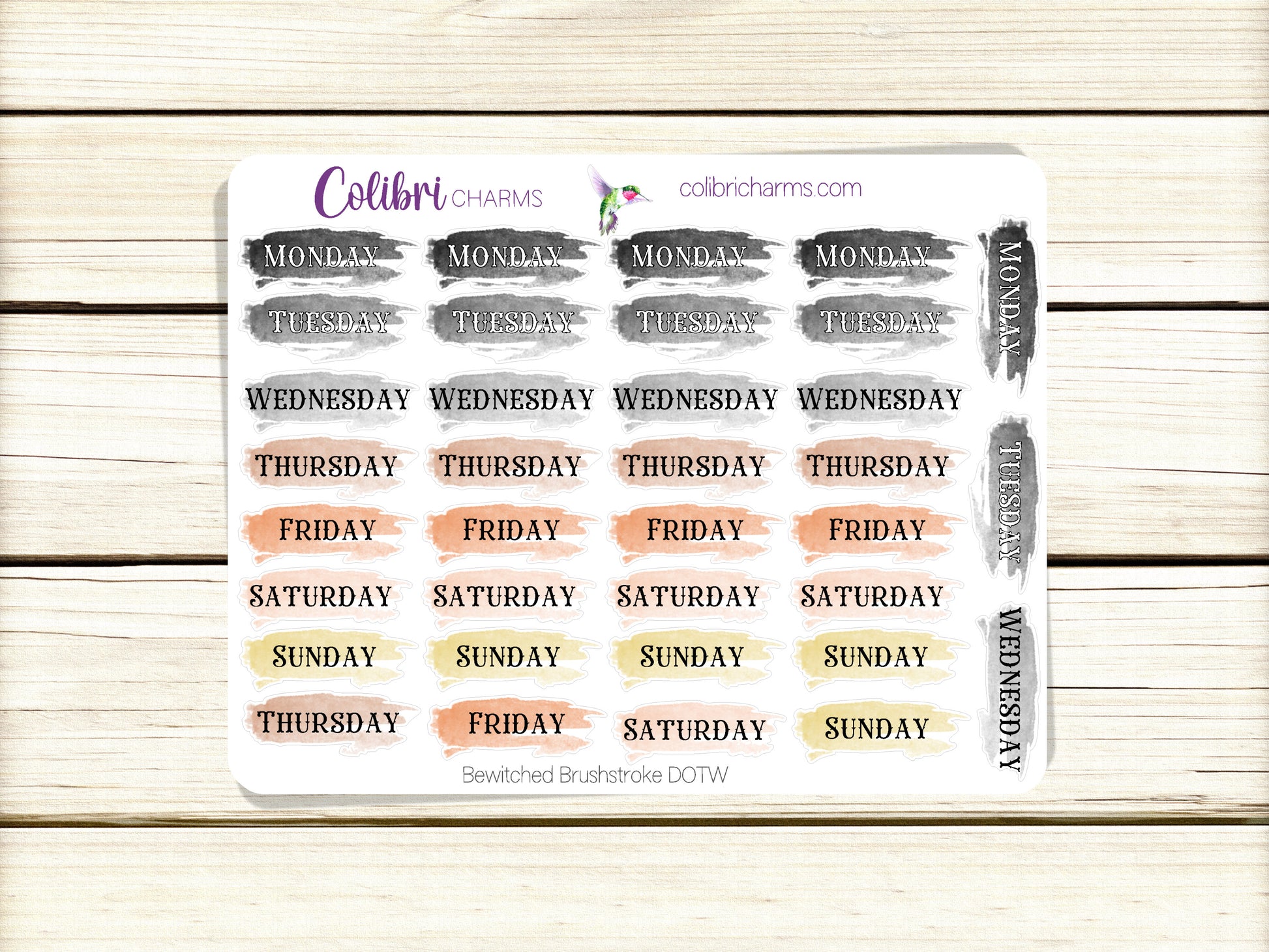 Bewitched Days of the Week Planner Stickers, Colorful Watercolor DOTW, Number Stickers, Date Dots