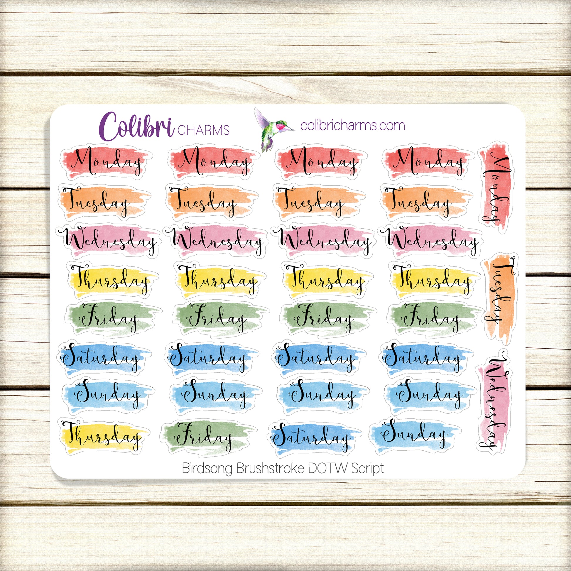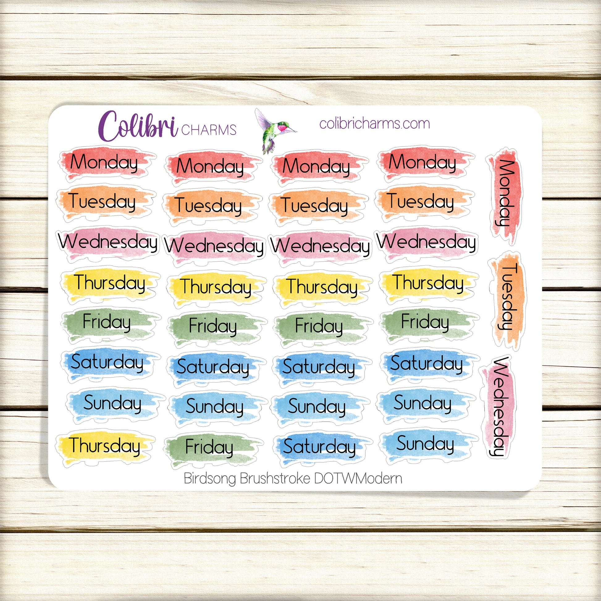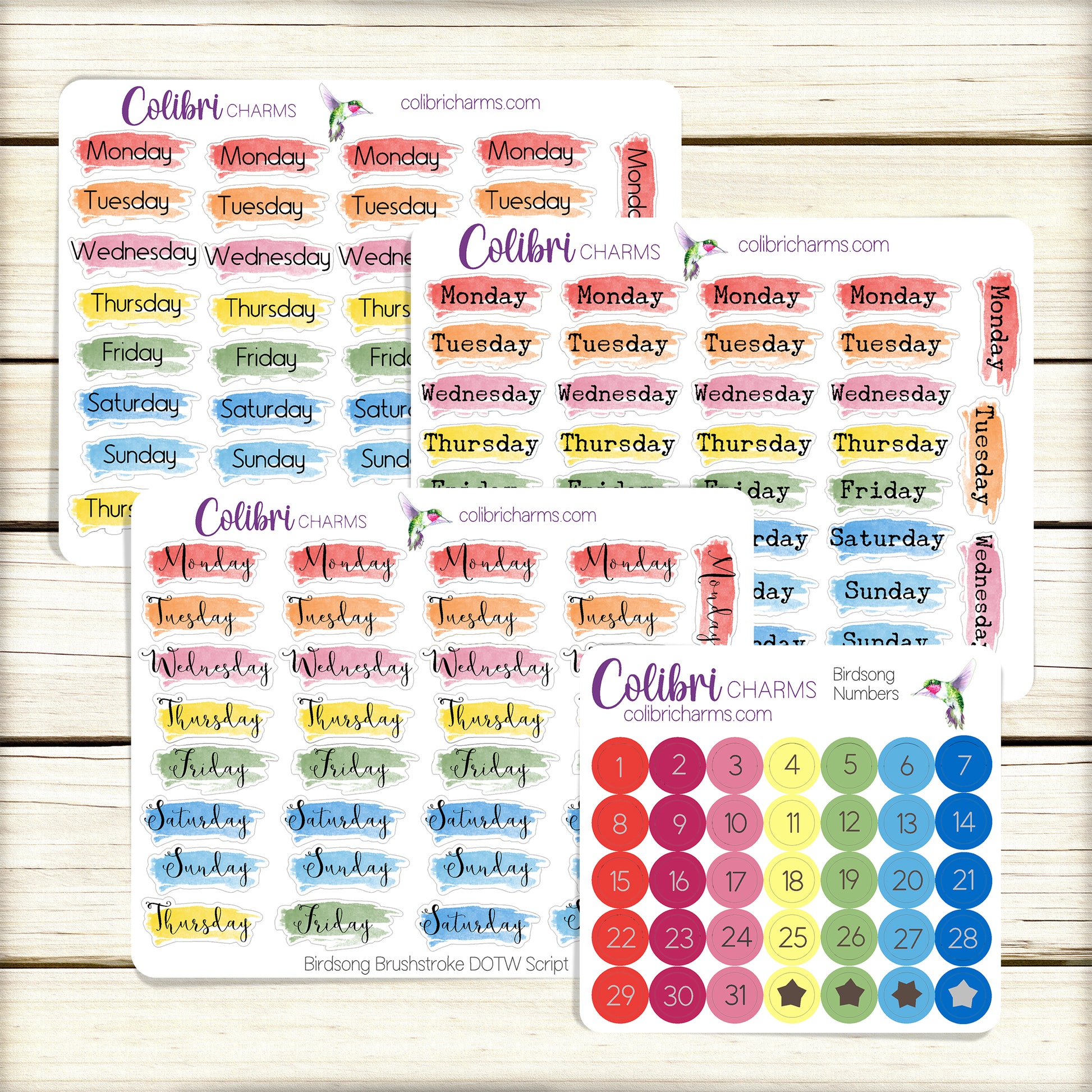 Birdsong Brushstroke Days of the Week Planner Stickers | Colorful Watercolor DOTW | Number Stickers | Date Dots