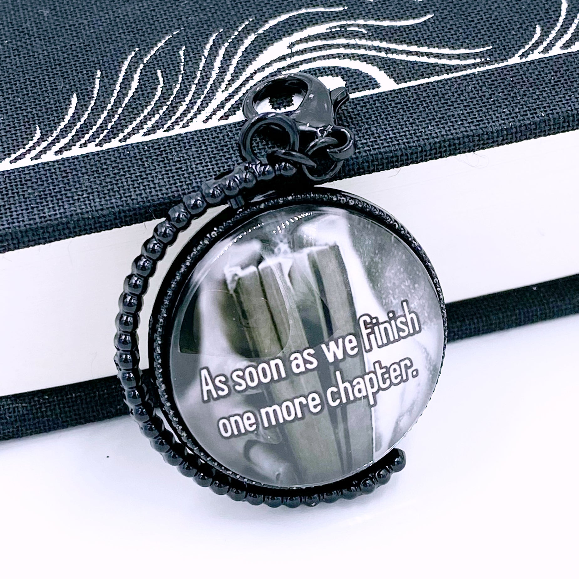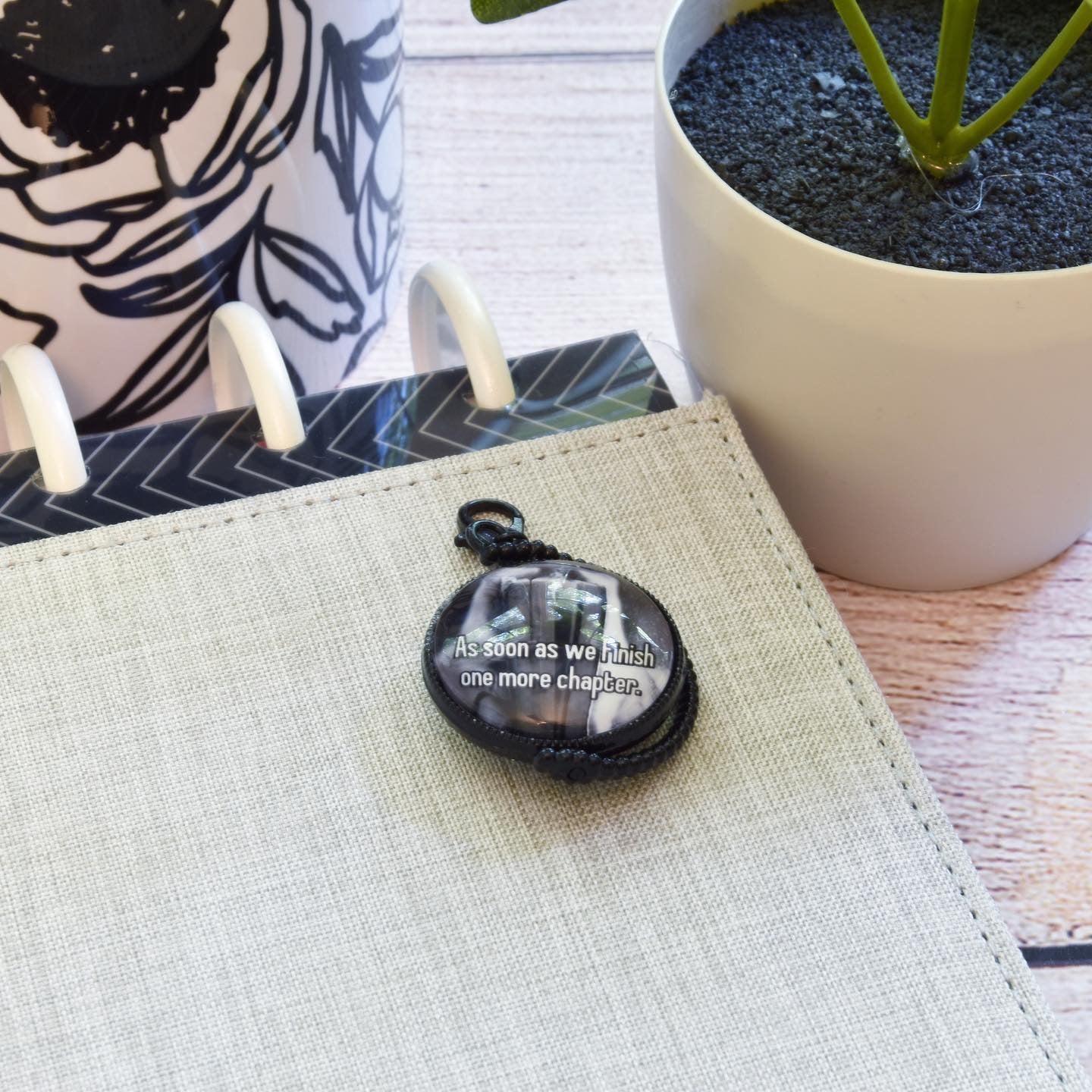 This beautiful two-sided charms are on a swivel, with one side that says, "Bookworms will rule the world" and the other, "As soon as we finish one more chapter." These unique charms are hand-made from art under ultra-clear 1” glass domes, about the size of a quarter. They're mounted on black metal, and available on a silver lobster clasp, silver ring clasp. a silver jumbo paper clip, a silver bookmark.