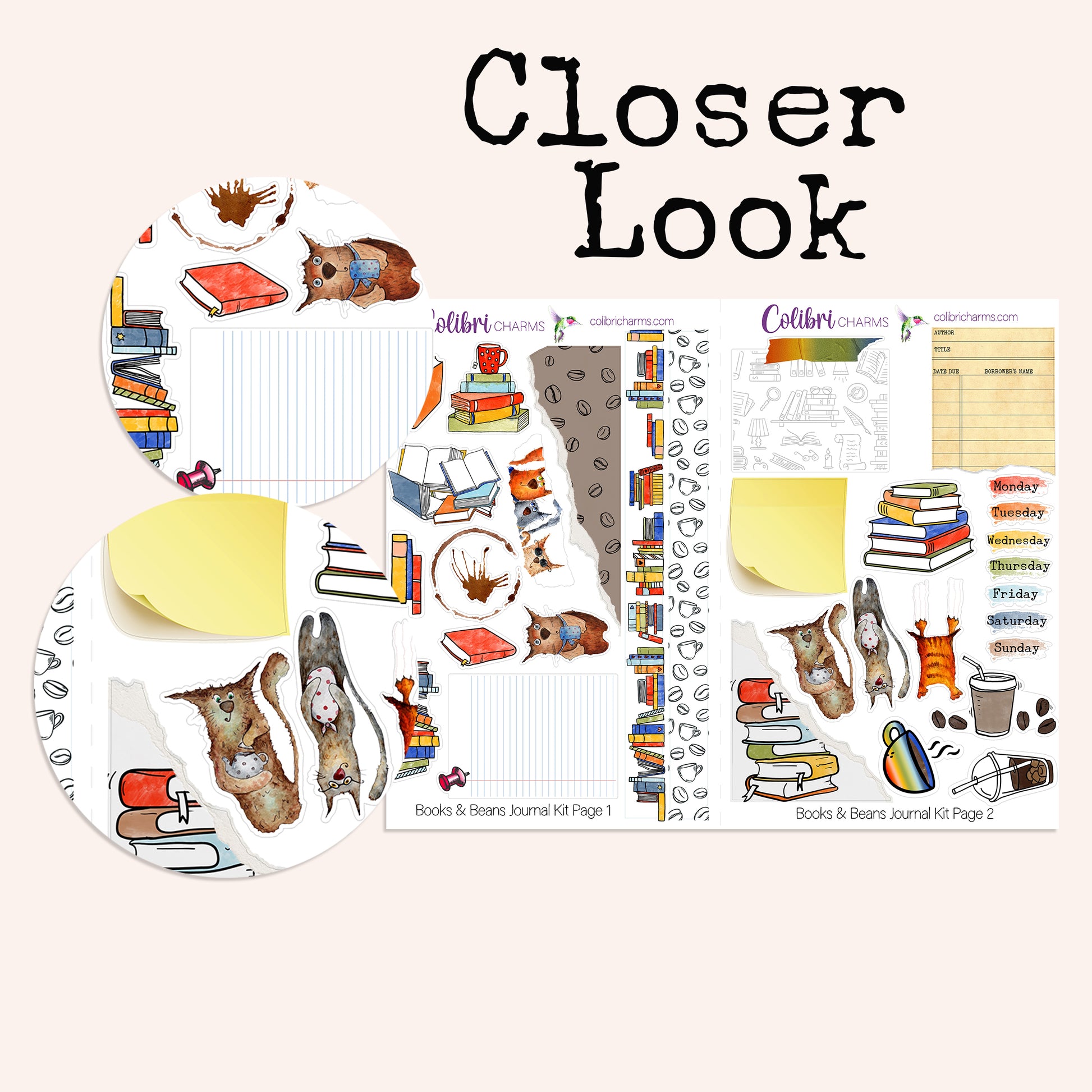 Books & Beans Journal Kit | Avid Reader Planner Decor | Coffee Lover Stickers | Cat Fancier Planner Stickers | Bullet | Bujo