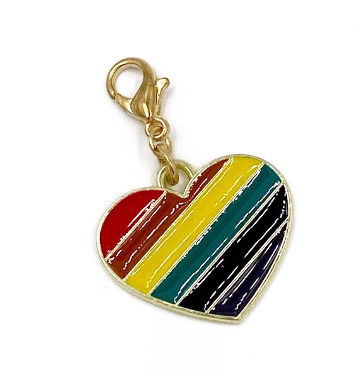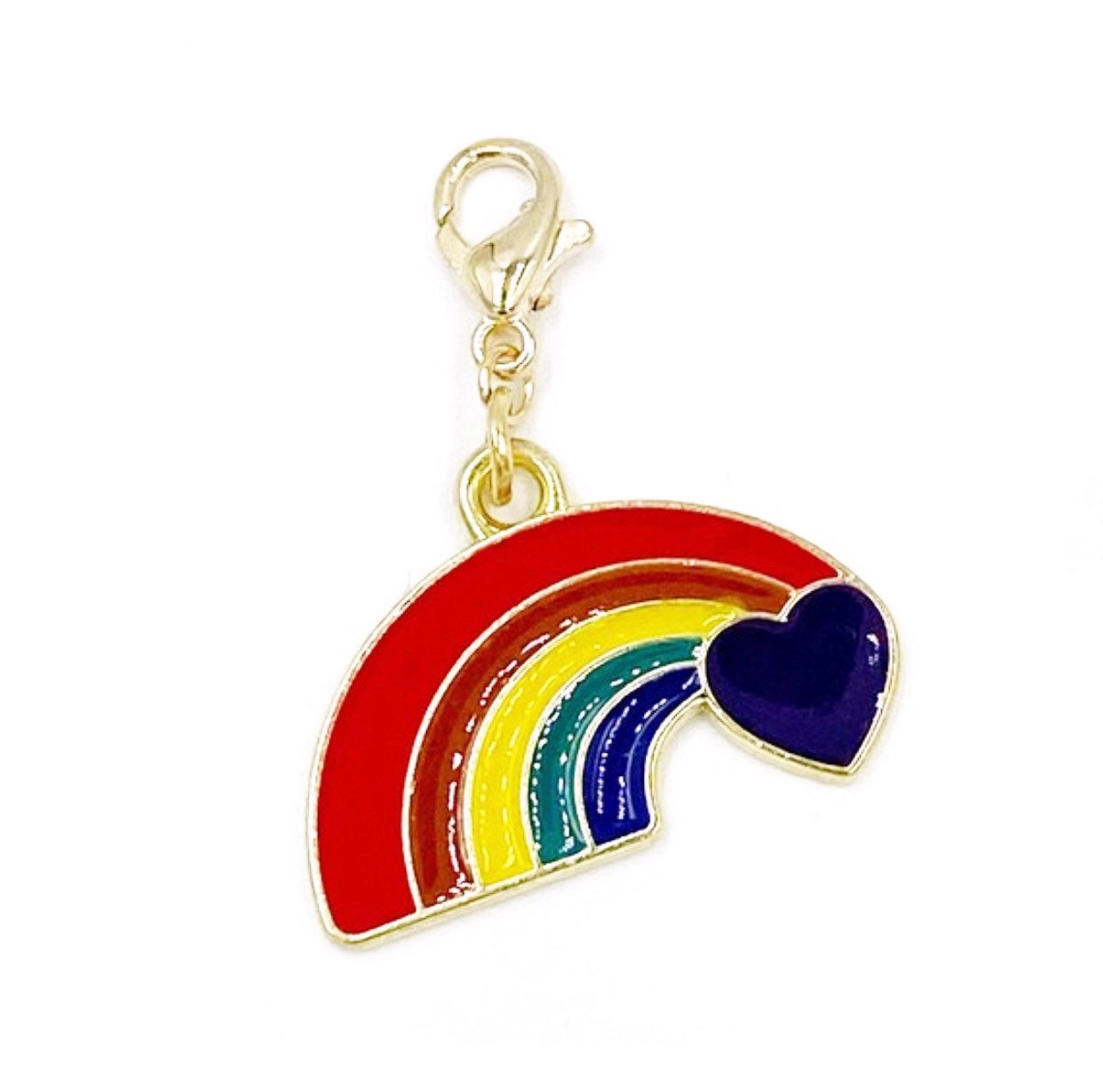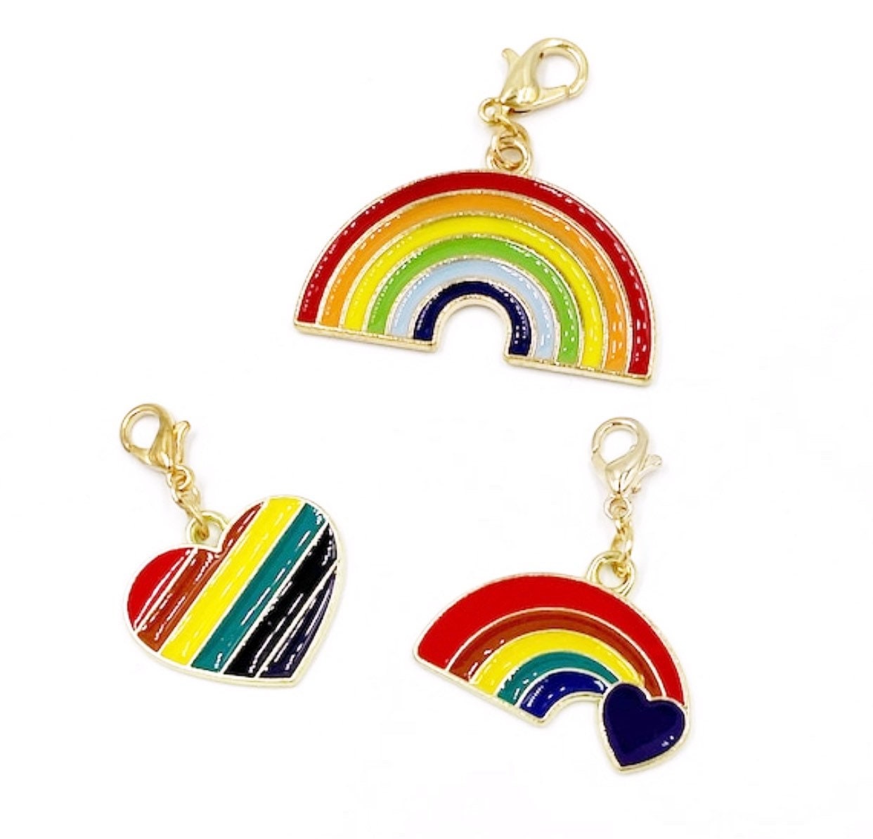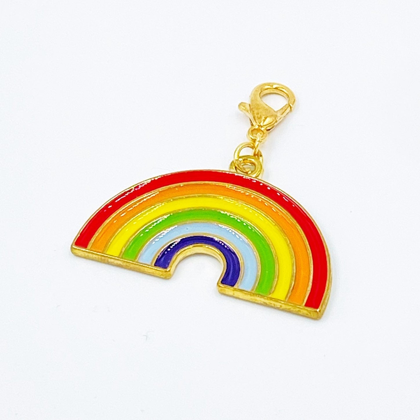 This charm features stylized enamel rainbows, with gold-tone lobster clasp (silver is pictured). Choose from a regular rainbow, a heart, or rainbow with small heart. Regular Rainbow is about 1.25” wide and 3/4” tall. Also available on a gold-color jumbo paper clip or a gold-tone bookmark.