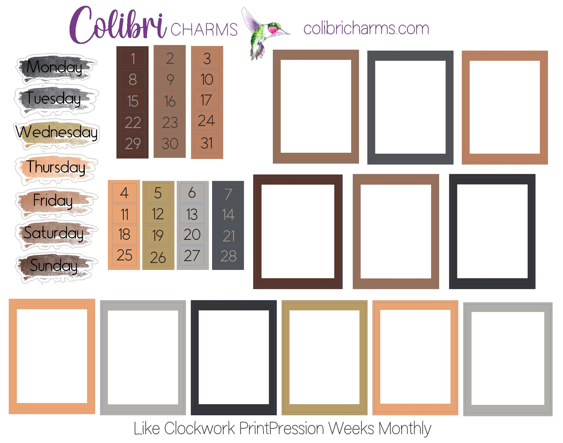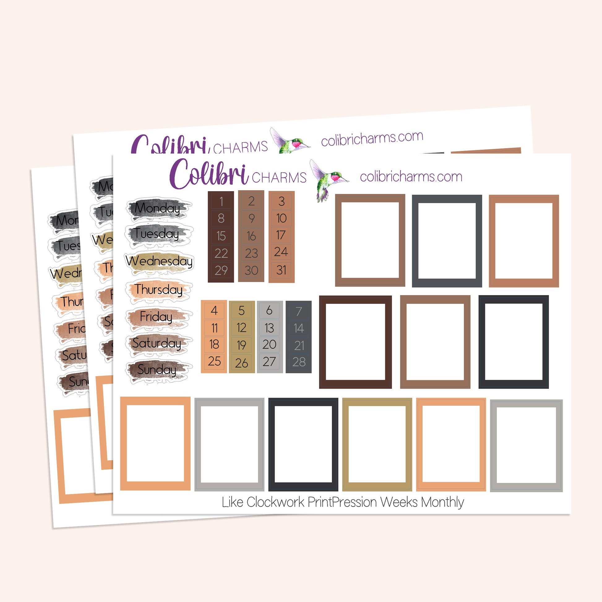 These lovely stickers are designed specifically for the PrintPression Weeks' monthly layout. They include days of the week watercolor brushstroke stickers and tiny numbers sized to the monthly grid. These neutral colors are the perfect accompaniment for our steampunk-themed Like Clockwork collection.