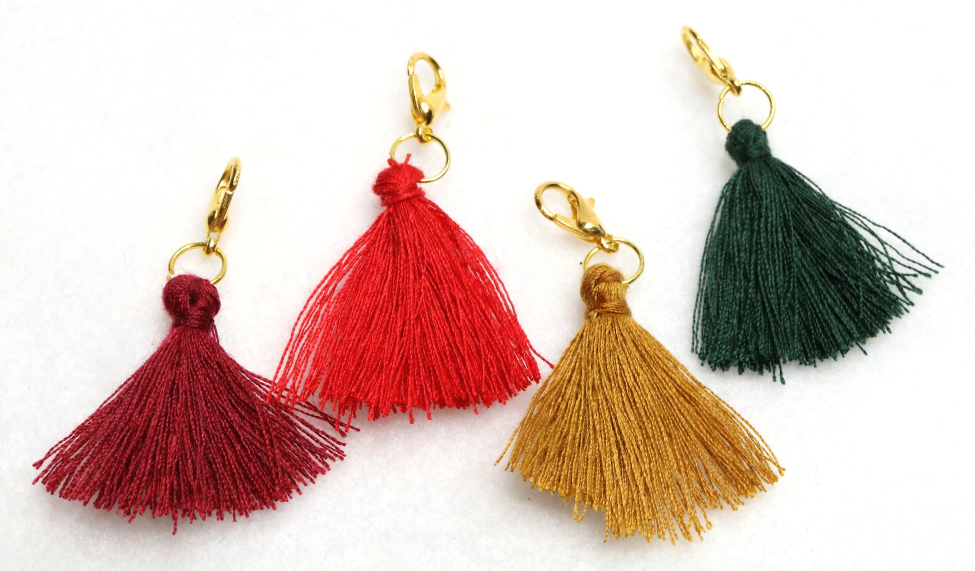 These small thread tassels are a great addition to other charms on your planner, or put three together! Red and green tassels measure about 1.25" and the burgundy and gold tassels measure about 1" (not including hardware). Available with silver or gold hardware.