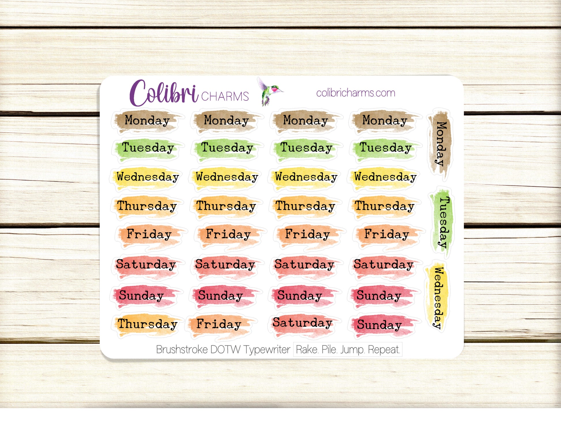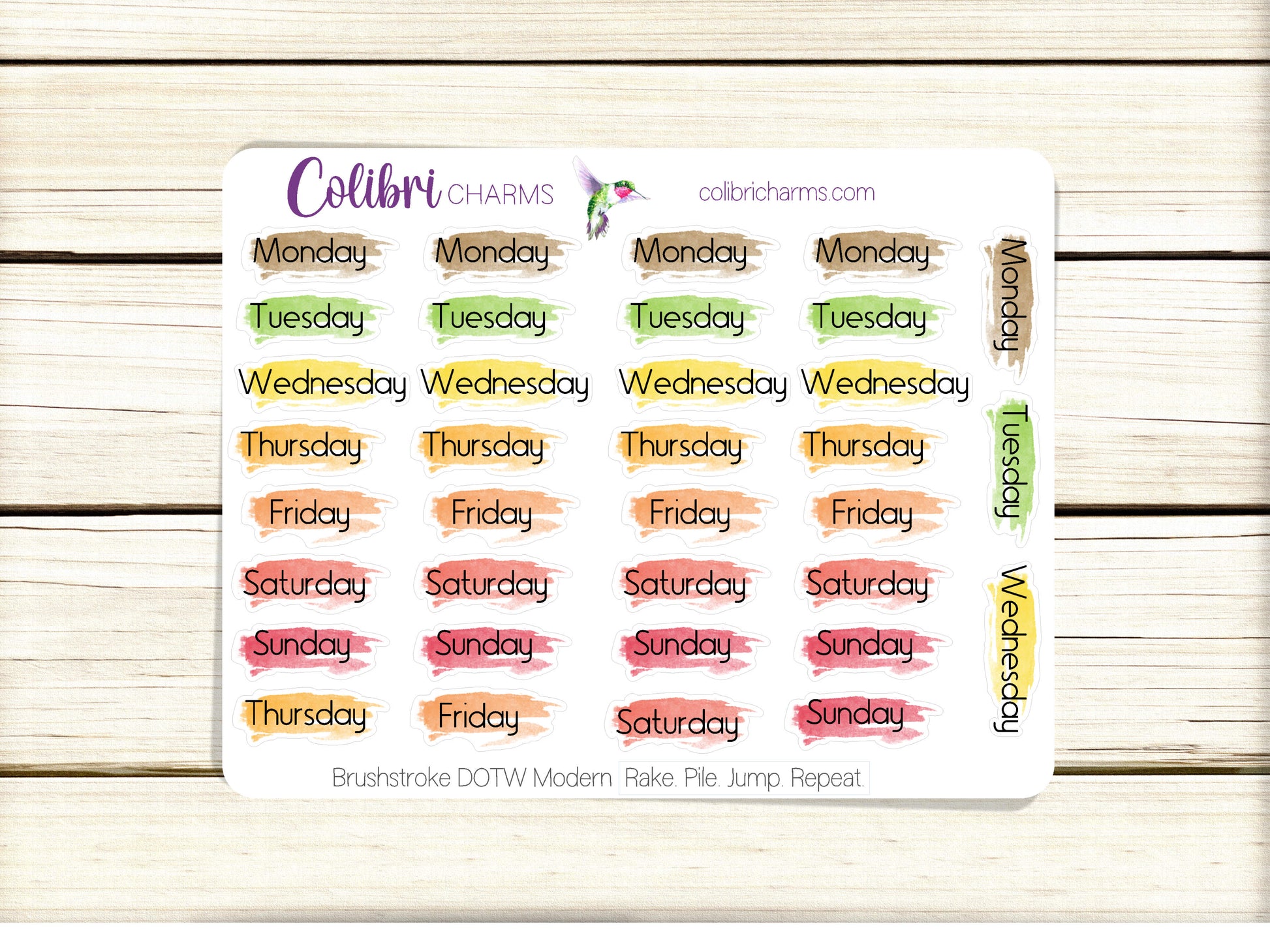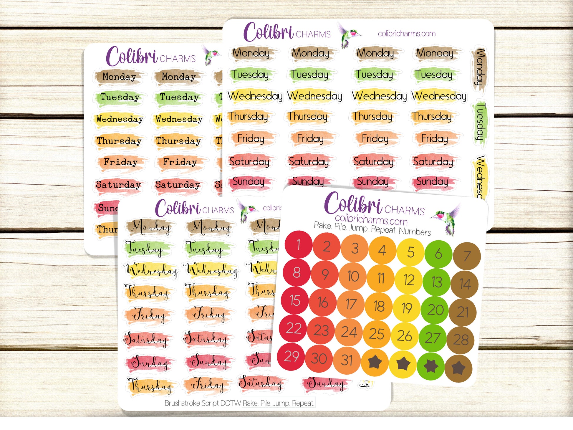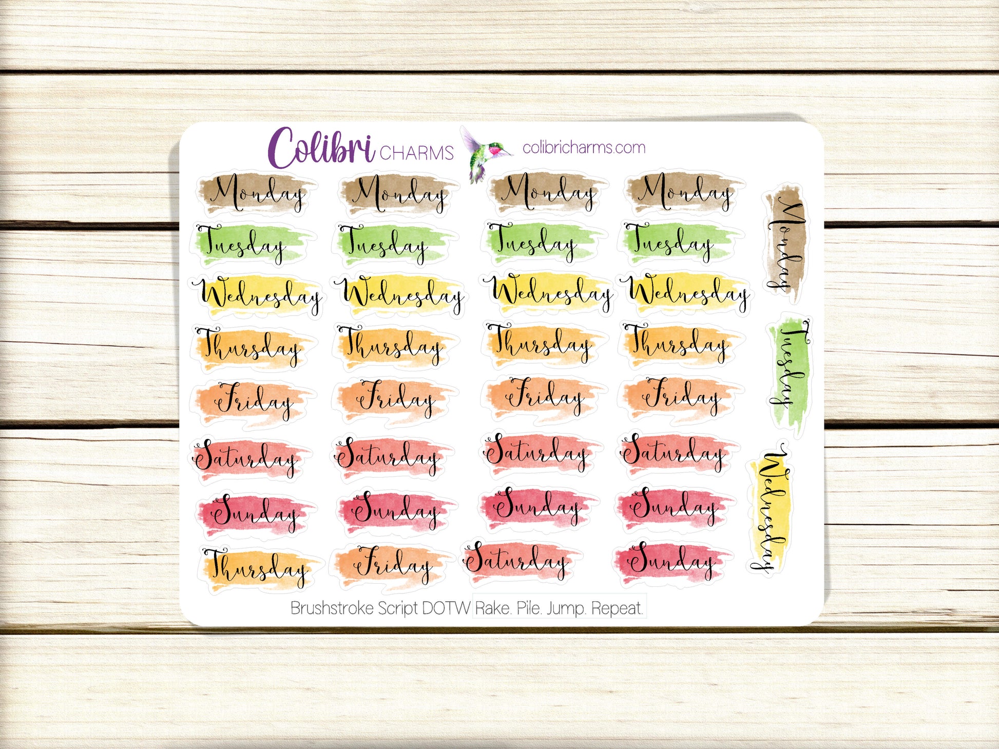 Rake. Pile. Jump. Repeat. Brushstroke Days of the Week Planner Stickers, Colorful Watercolor DOTW, Number Stickers, Date Dots
