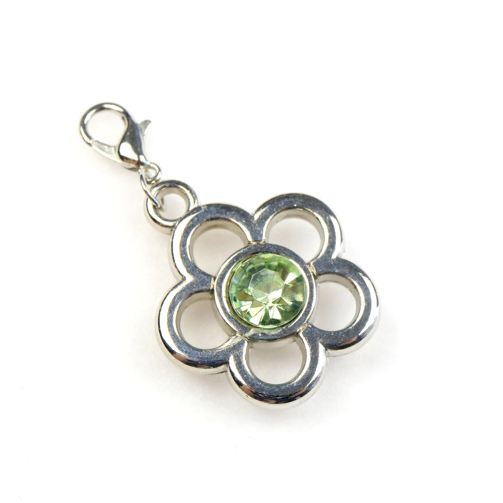 These cheery little flowers are perfect for any planner. They're silver-tone acrylic with colored gem centers. Available in a range of colors, on a silver lobster clasp, large silver-tone clasp, silver-tone bookmark, or paper clip.