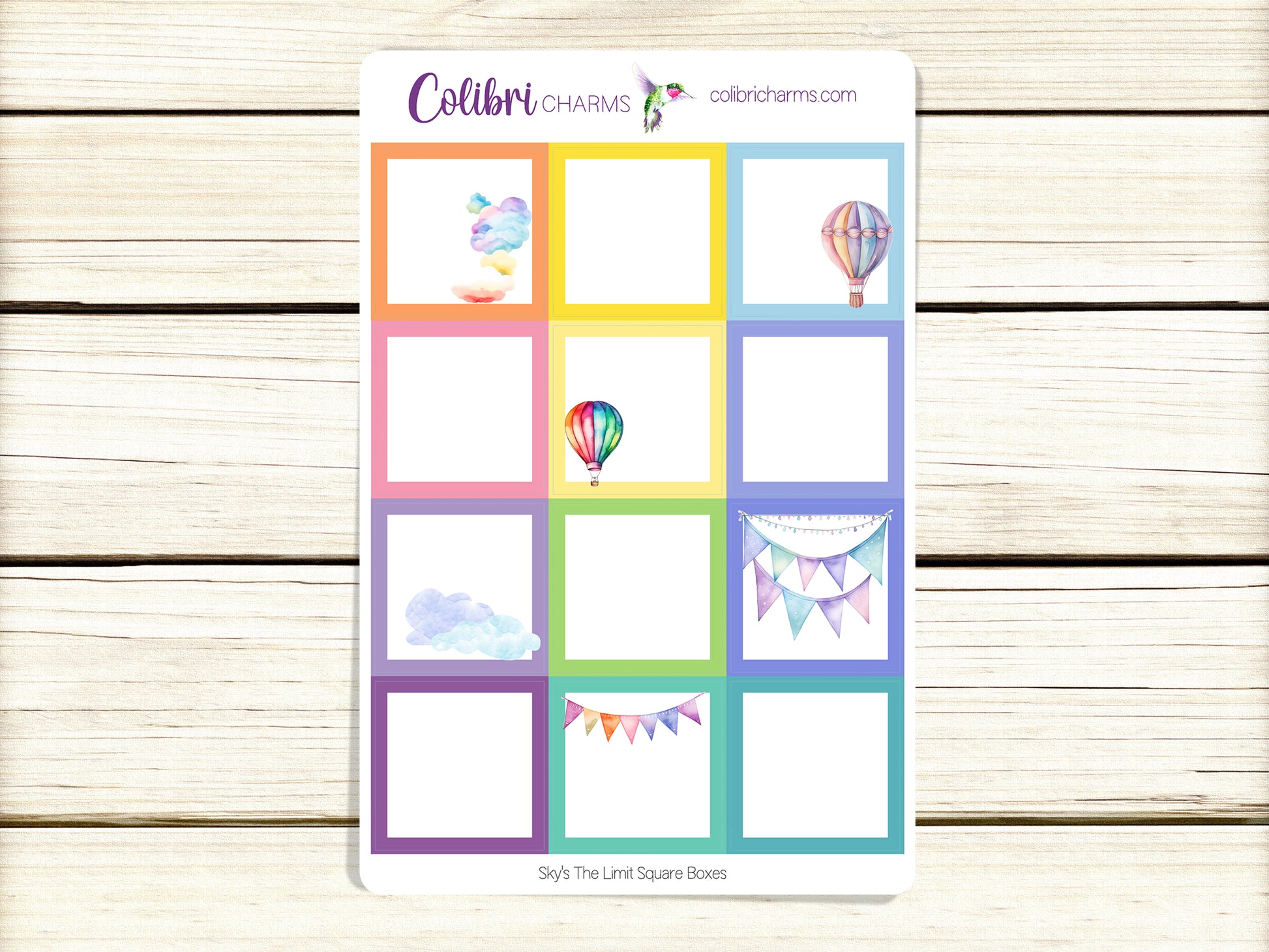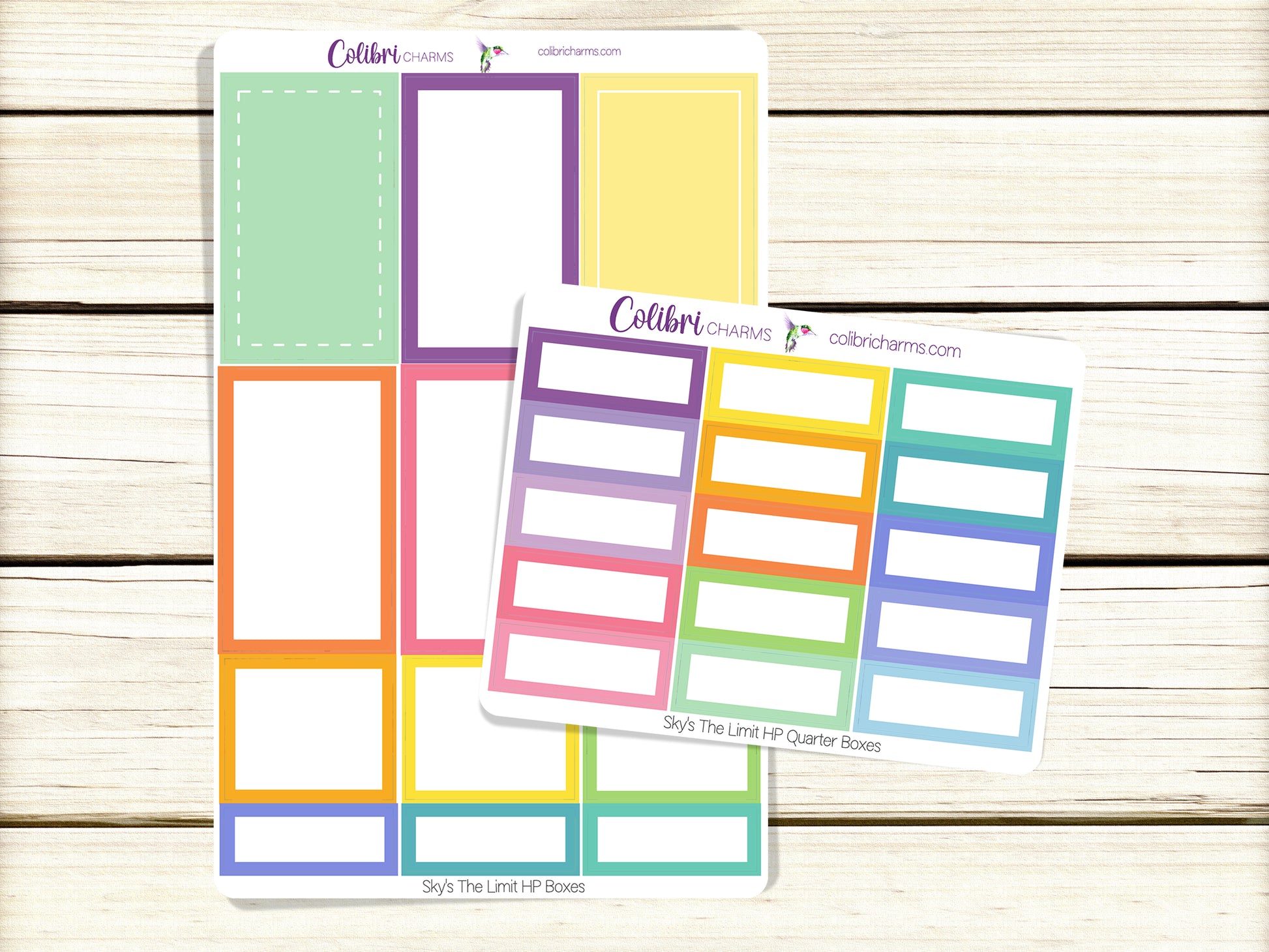 These lovely stickers coordinate with our Sky's The Limit collection. Get individual sticker sheets of Large, Half and Quarter Boxes, a sheet of Quarter Boxes or a sheet of Square Boxes, or buy them as a set at a discount.