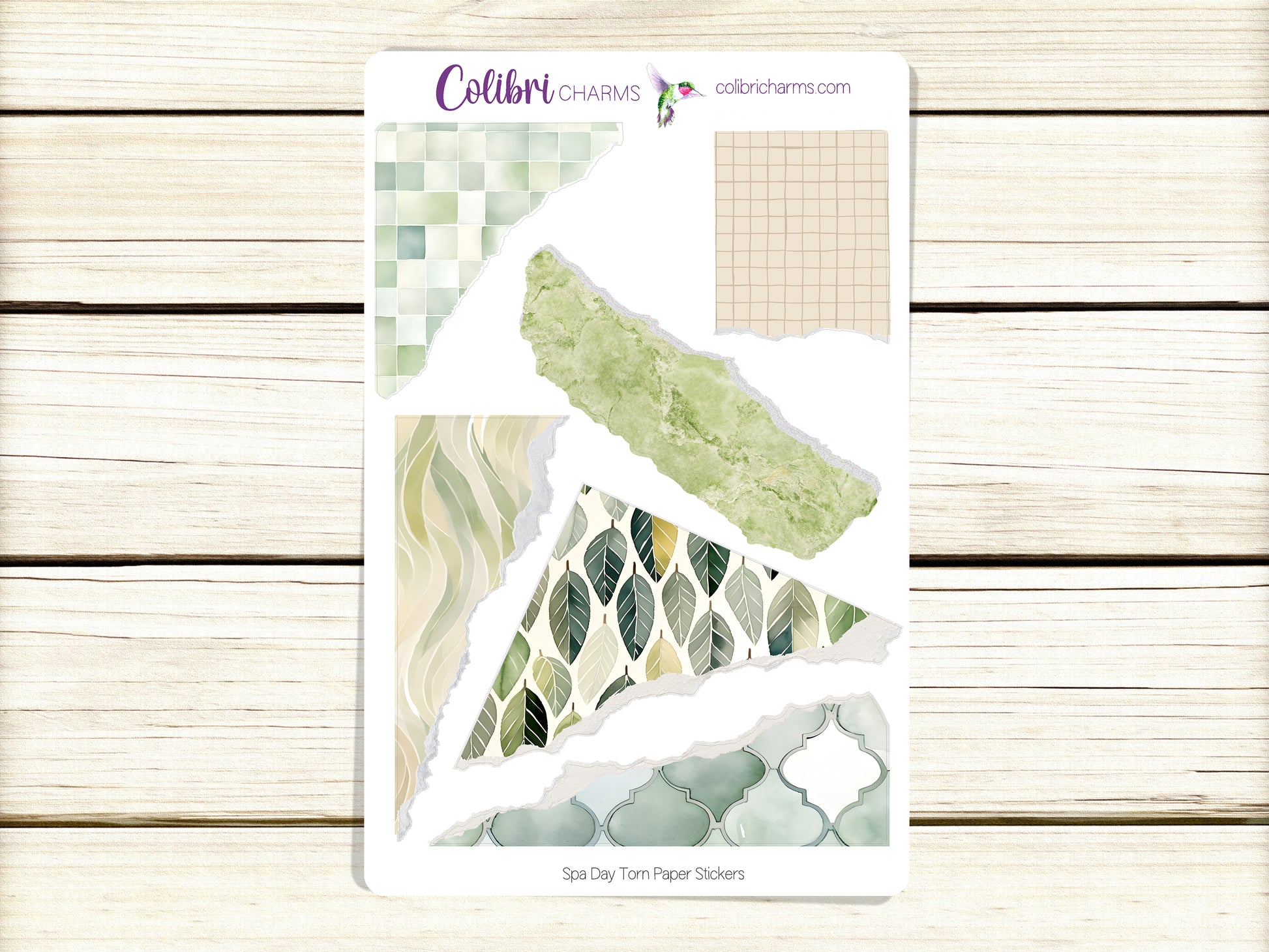 Spa Day Torn Paper Stickers | Self Care Deco Planner Stickers | Distressed Ripped Paper