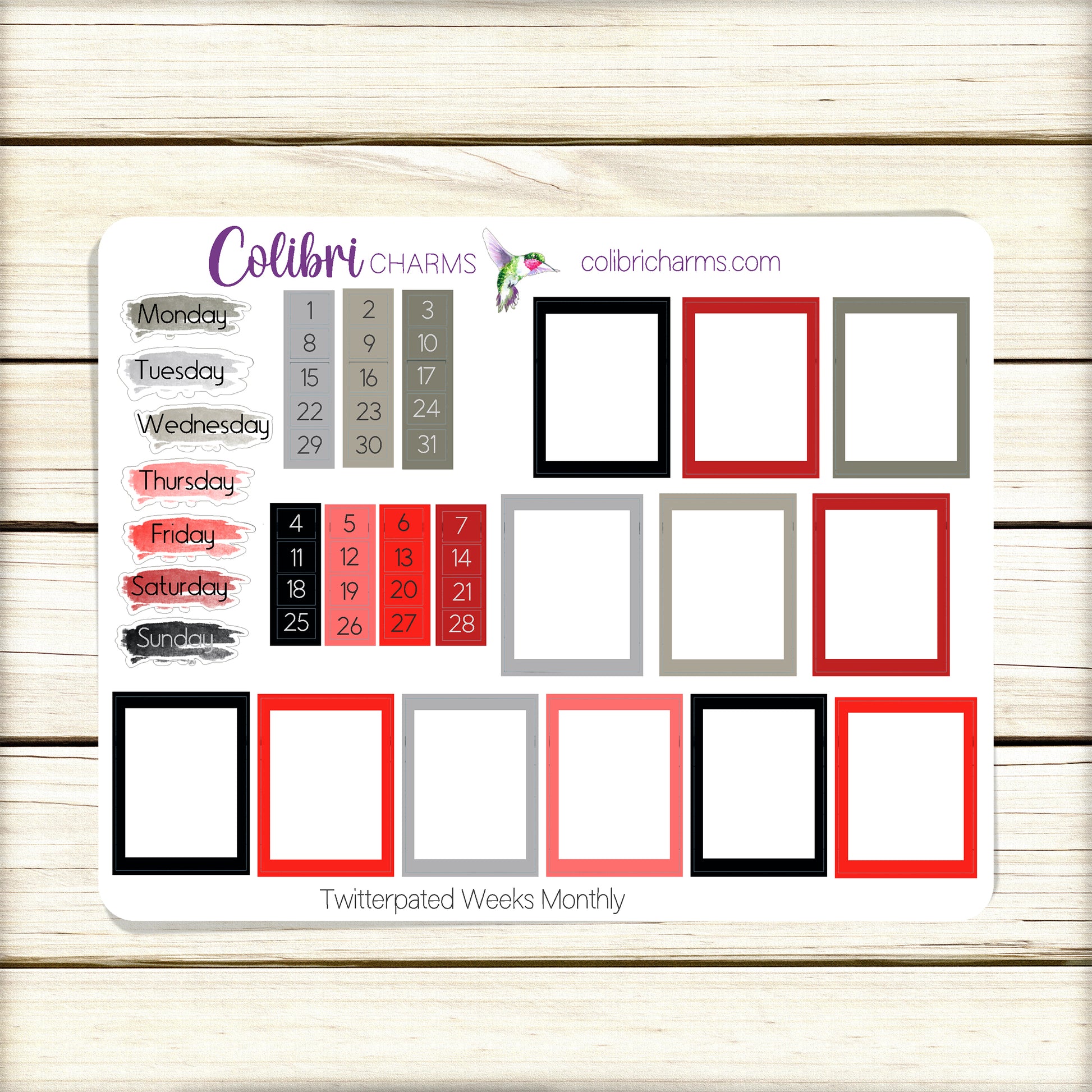 These lovely stickers are designed specifically for the PrintPression Weeks' monthly layout. They include days of the week watercolor brushstroke stickers and tiny numbers sized to the monthly grid. These bright colors are the perfect accompaniment for our red and black, Valentine-themed Twitterpated collection.