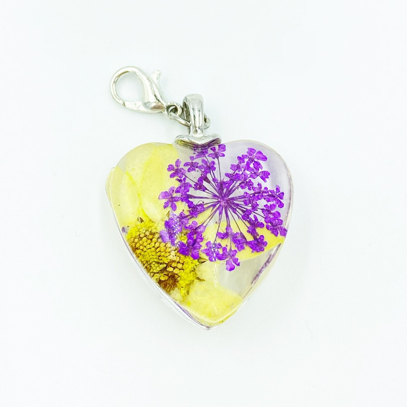 These spectacular charms are handmade, so each one is one of a kind. Dried flowers are sandwiched between two clear glass hearts, resulting in a hypnotically beautiful charm. Each charm is pictured front and back, as the sides are different. Available on a silver-tone lobster clasp, a large ring clasp, a jumbo silver-tone paper clip, or a silver-tone bookmark.